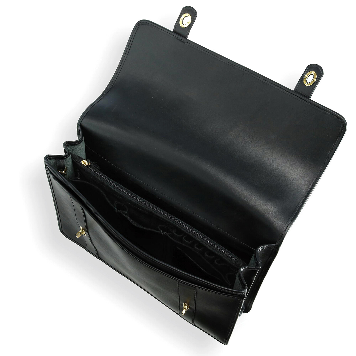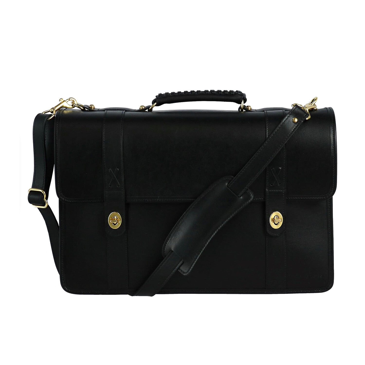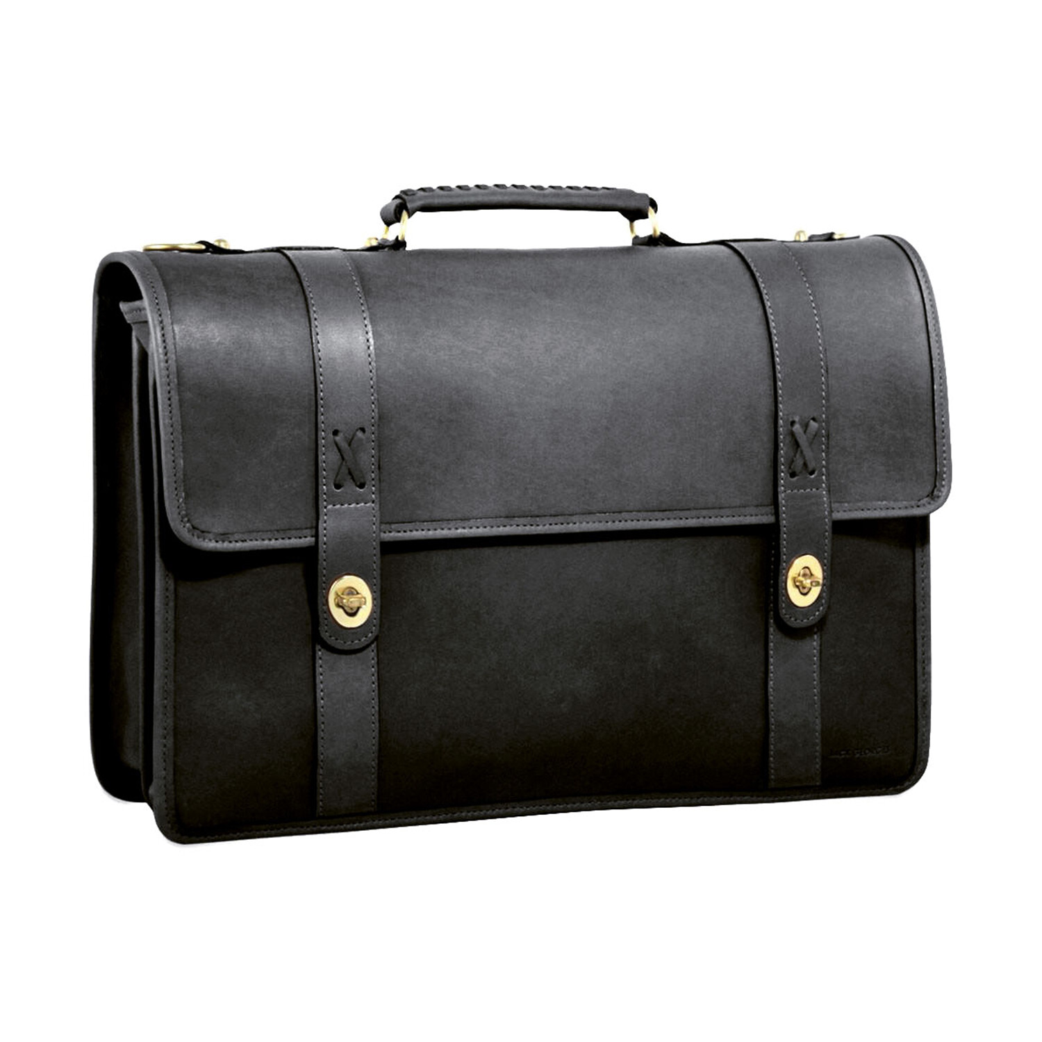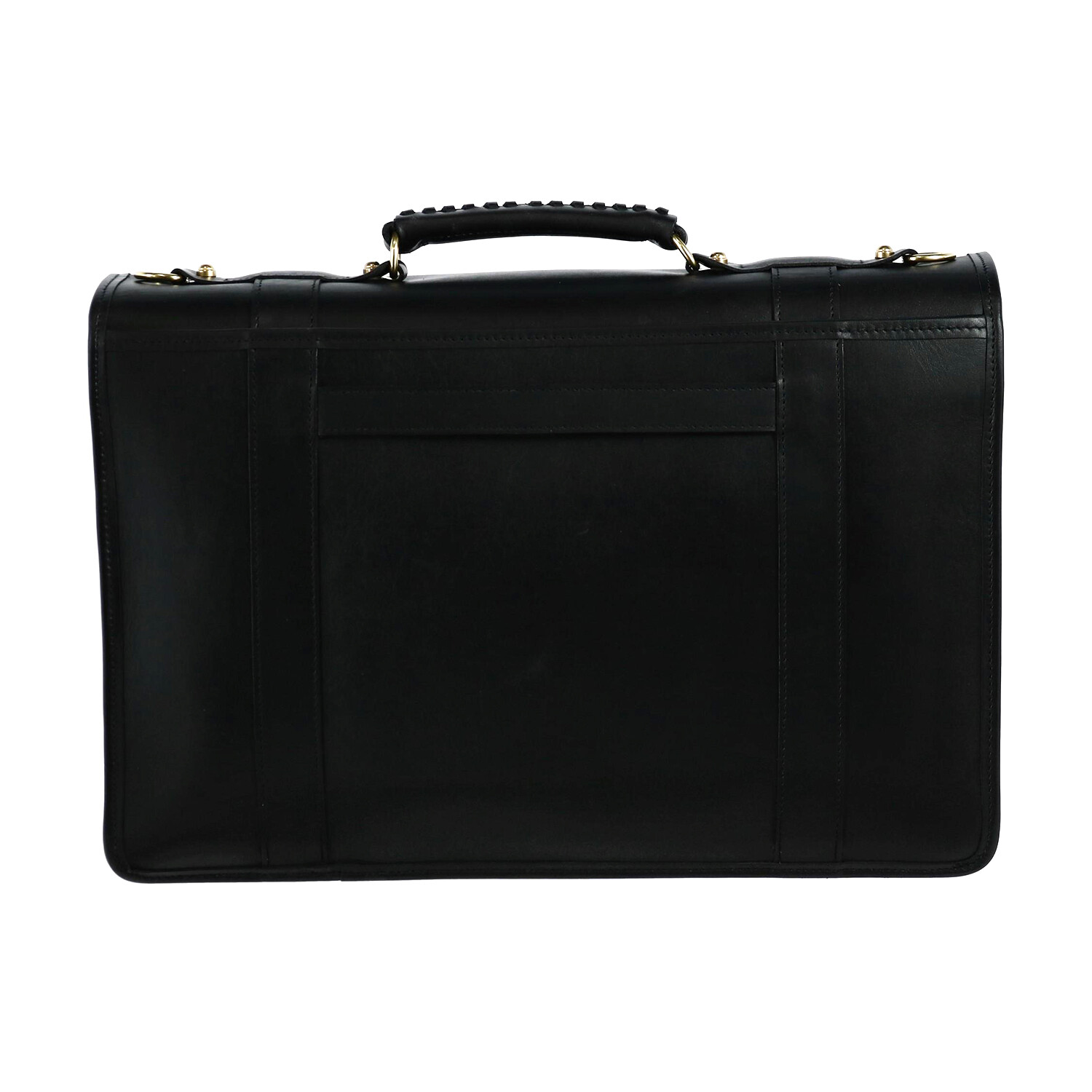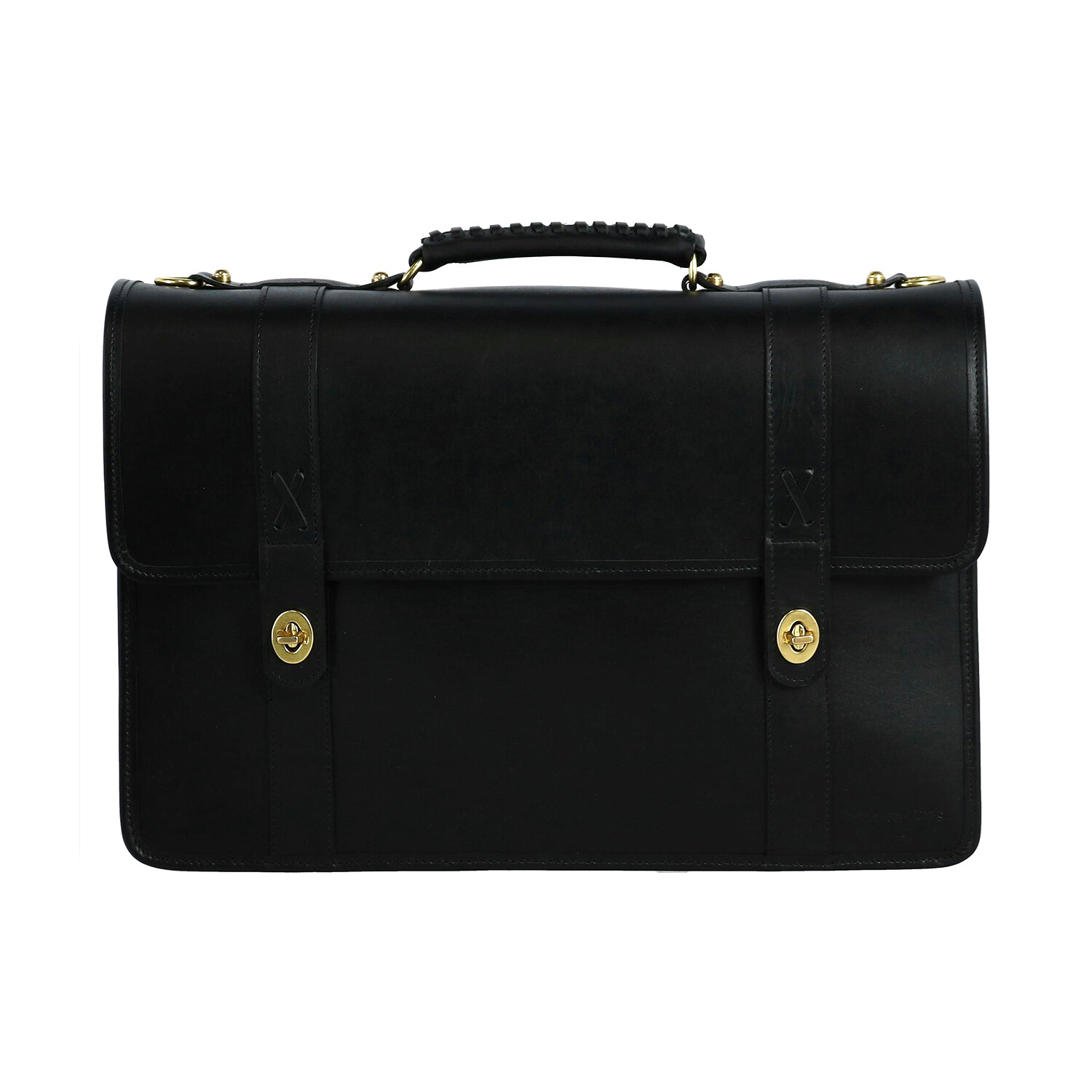 Organize in elegance with this leather briefcase from Crookhorn Davis. Its double gussets allow for you to carry all that you need. A long slip pocket on the back exterior is perfect for storing documents and items for easy access. The inside allows for greater organization with a zippered pocket divider, 3 gusset pockets, 5 pen holders, and a business card holder. Made from American Bullhide that has been vegetable tanned from double shoulder cuts. Hand stitch detailing and brass hardware finish off the professional look of this briefcase messenger.
