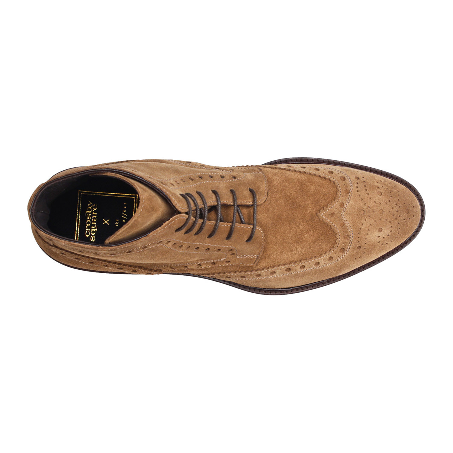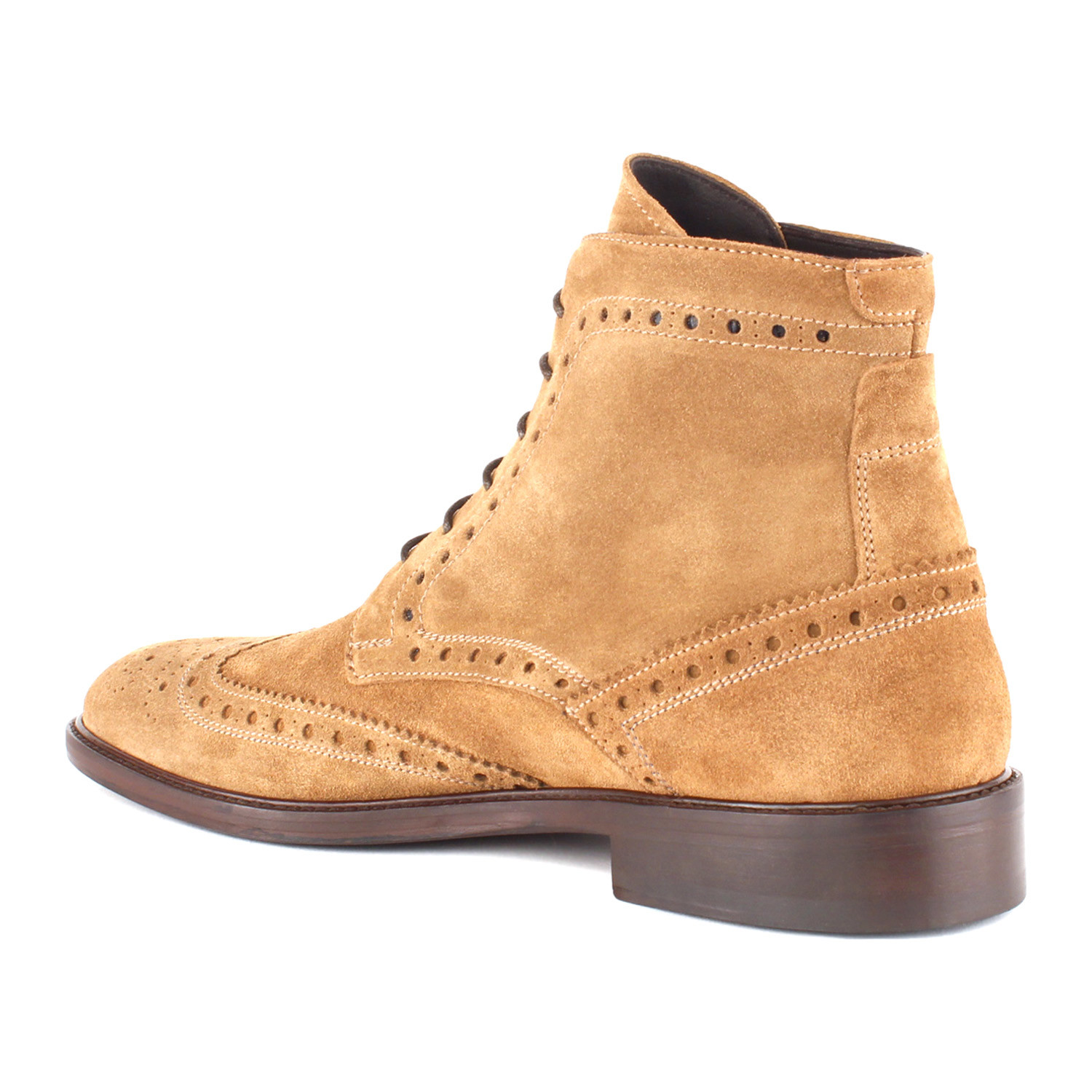 Classic wingtip lace-up boot with an Italian smooth grain leather upper that is hand finished on a leather outsole. Blake stitch construction. Features a fully leather lined footbed. Made in Italy.