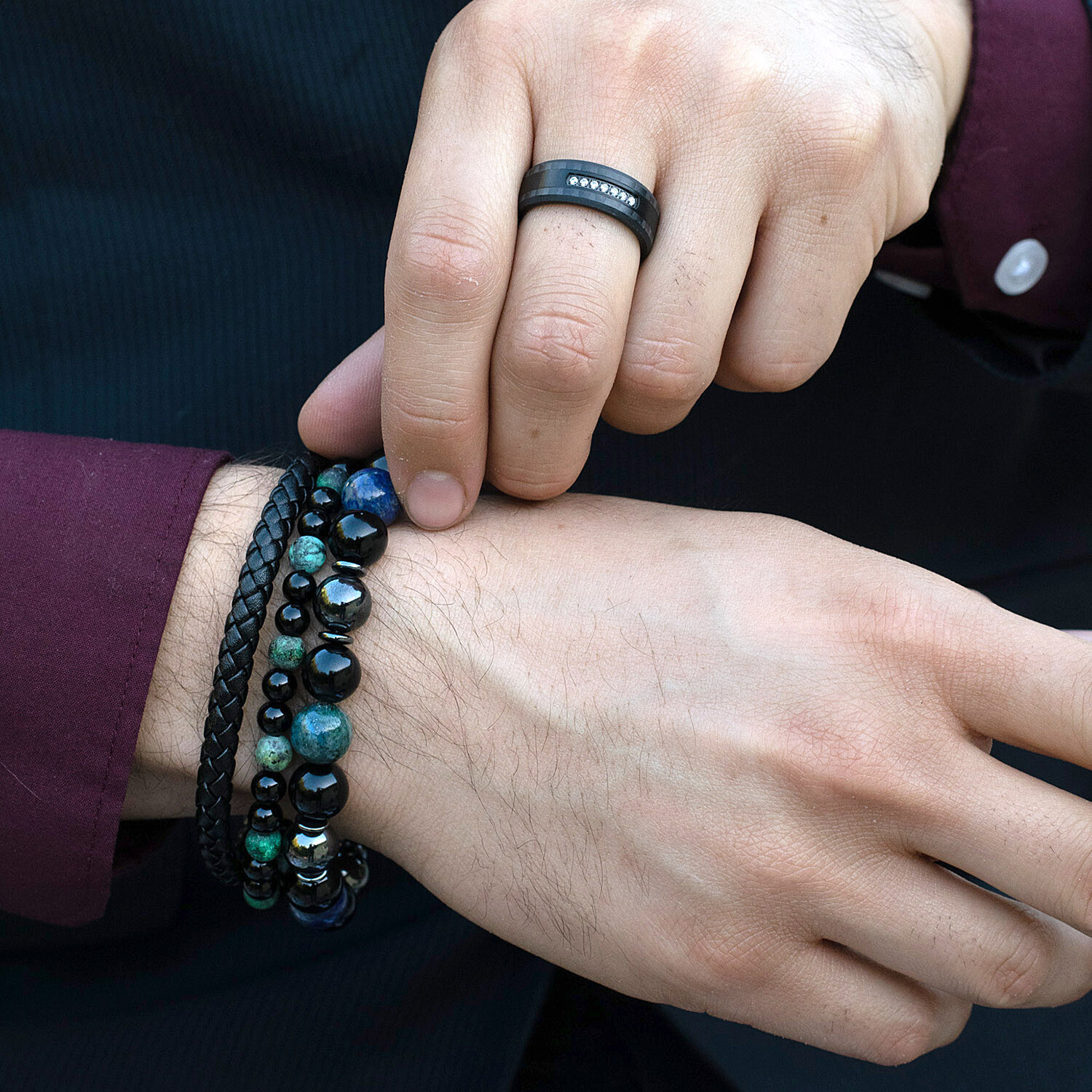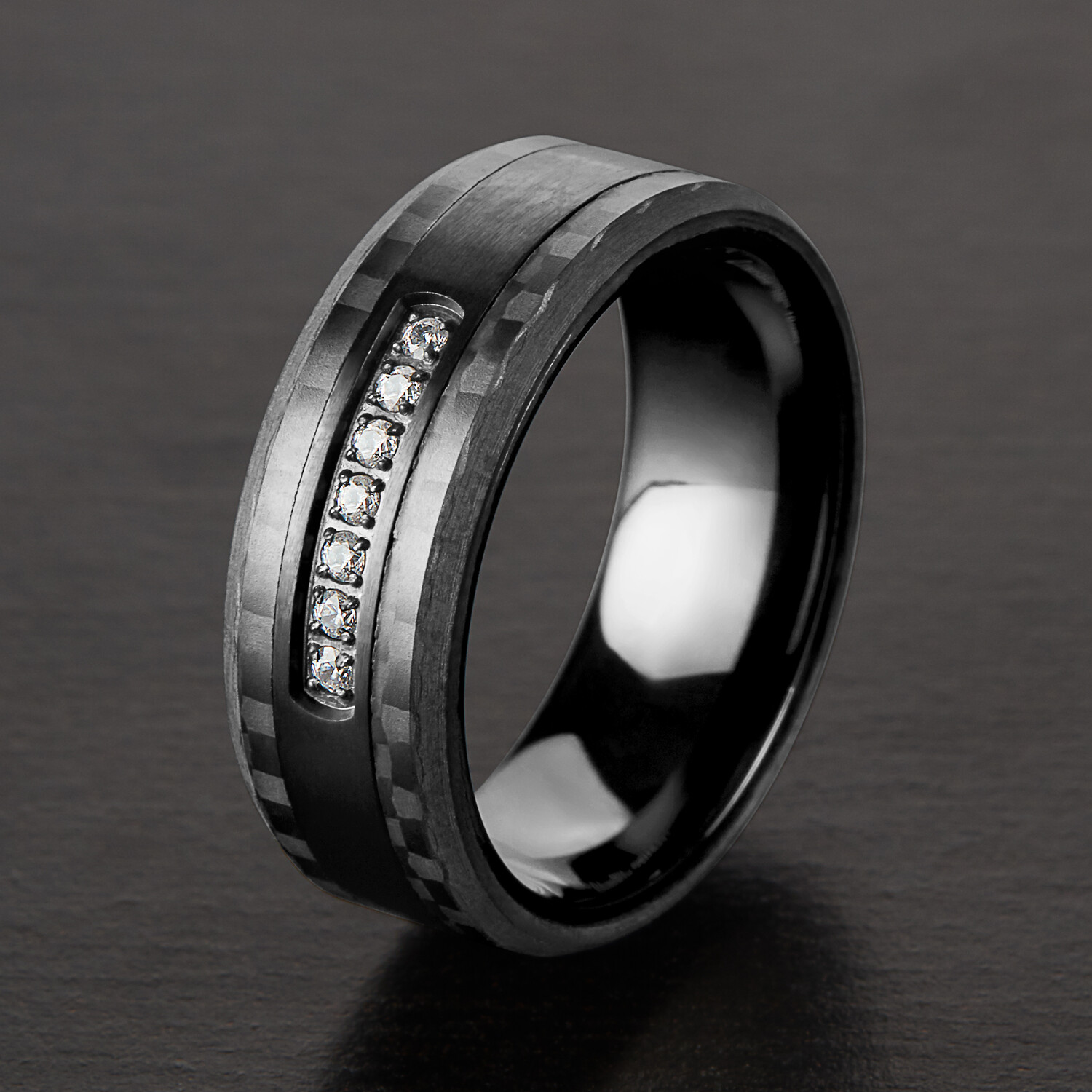 Carbon Fiber Center Cubic Zirconia Stones Black Plated Steel Band Ring // 8mm