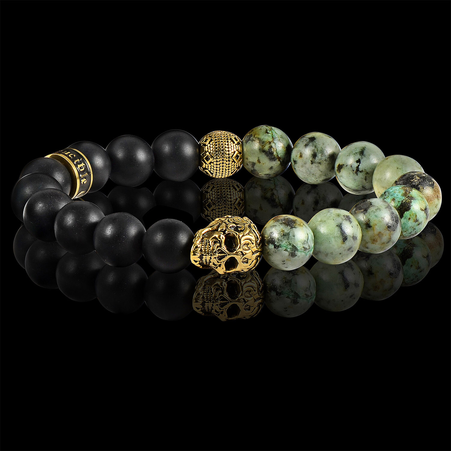 African Turquoise + Matte Onyx + Gold Plated Stainless Steel Skull Stretch Bracelet // 10mm