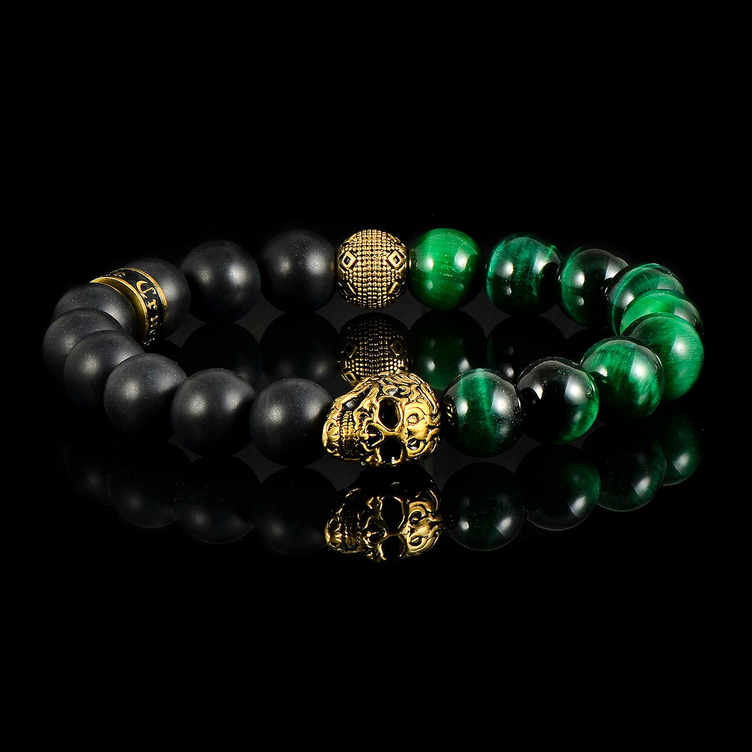 Gold Plated Steel Skull + Green Tiger Eye + Matte Onyx Stone Stretch Bracelet // 8"