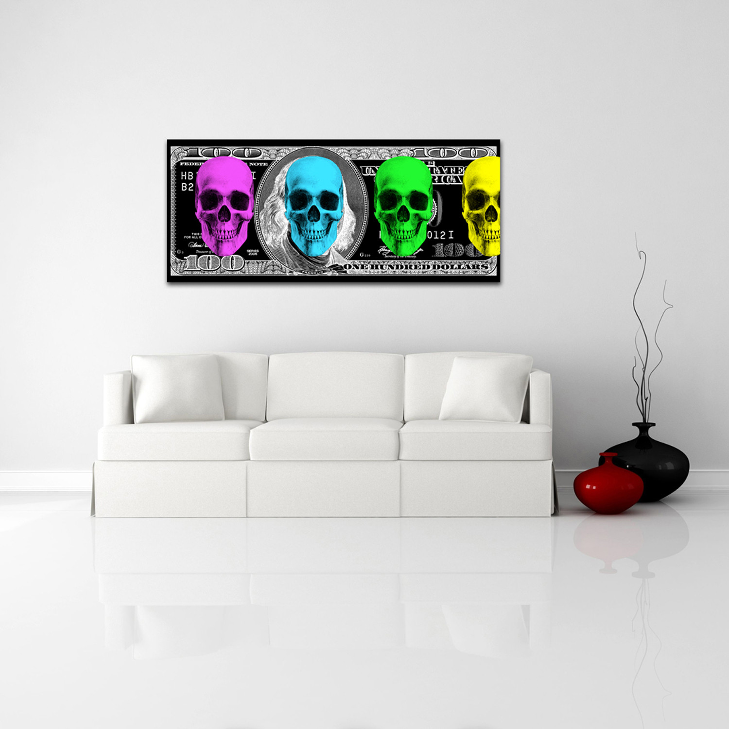 The United States 100 dollar bill gets the skeleton treatment in this vibrant graphic print. Don't fly under the radar — make your space memorable with this bold, ready-to-hang canvas.