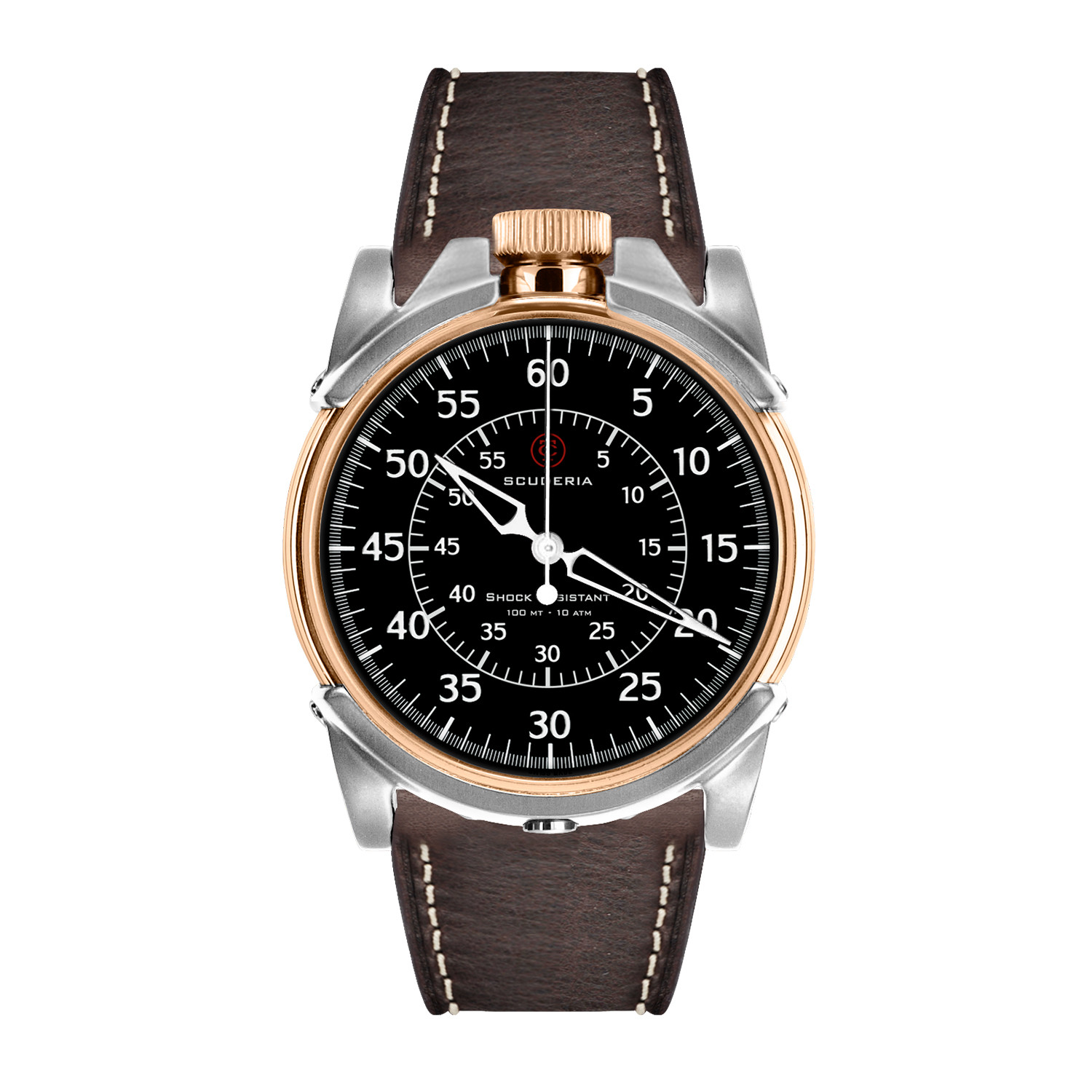 Setting speed records at the Bonneville Salt Flats is racing of a unique sort —no "0-60" records are broken here. Since the salt is somewhat slick, maintaining traction is a major concern of every racer. Cars start slower than many expect, but they make their way up to some very fast speeds. This watch's case construction is a piece of handmade industrial art, where the horns are molded to follow the ergonomic shape around the pushers and the crown to give the watch its unique look of endurance.