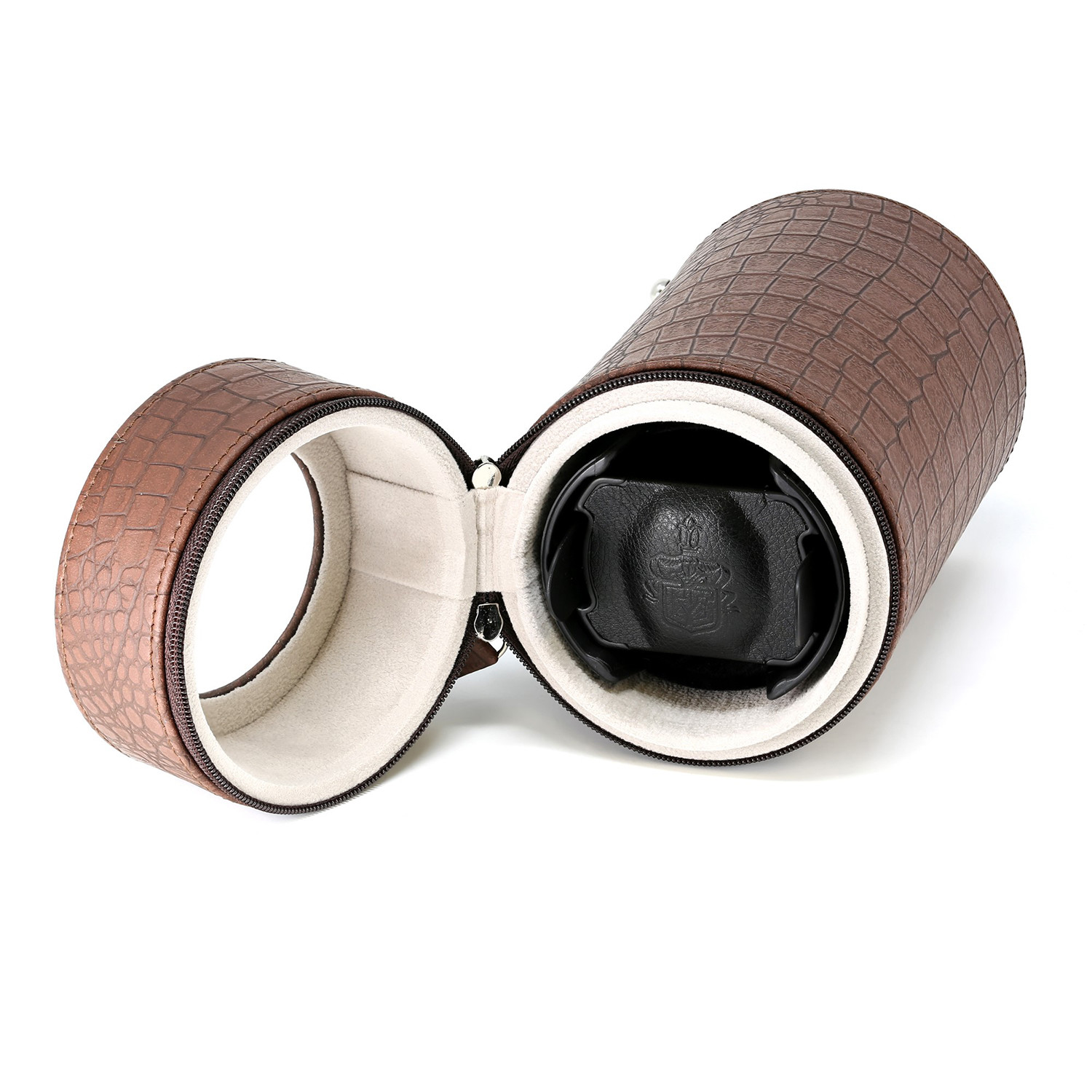 This watch includes a lacquered wooden watch case and alligator print leather watch winder.