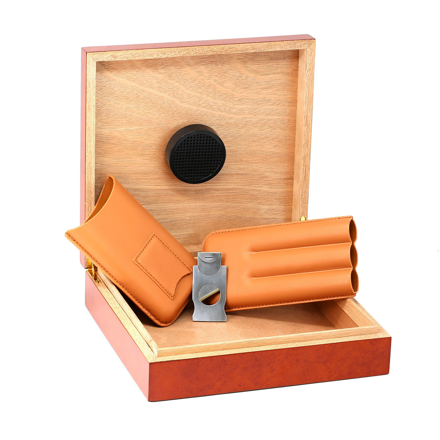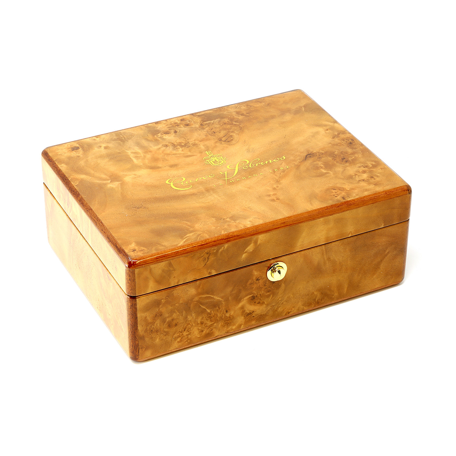 This watch includes a lacquered wooden watch case, alligator print leather watch winder, and cigar holder with cigar cutter and wooden box.