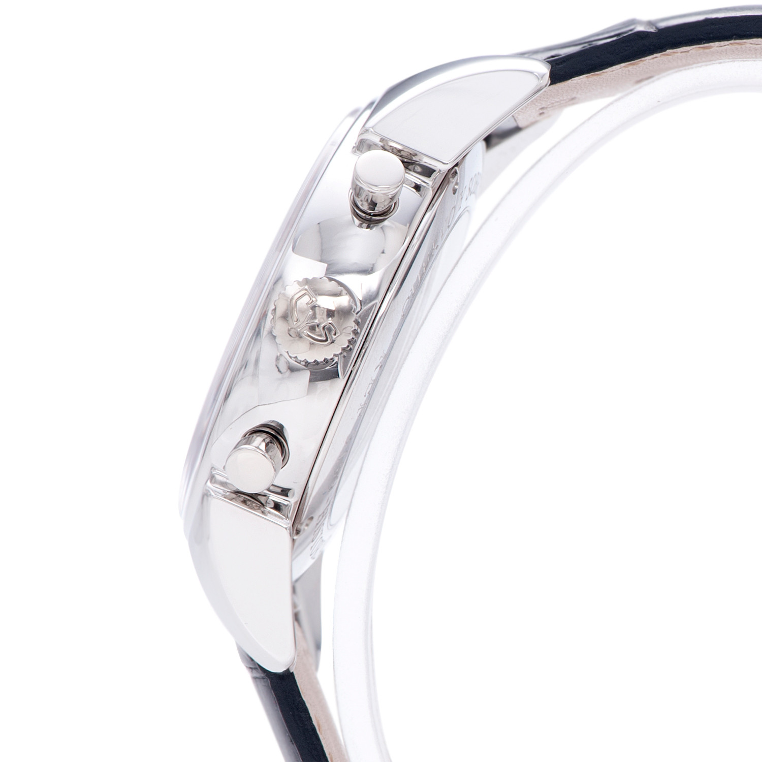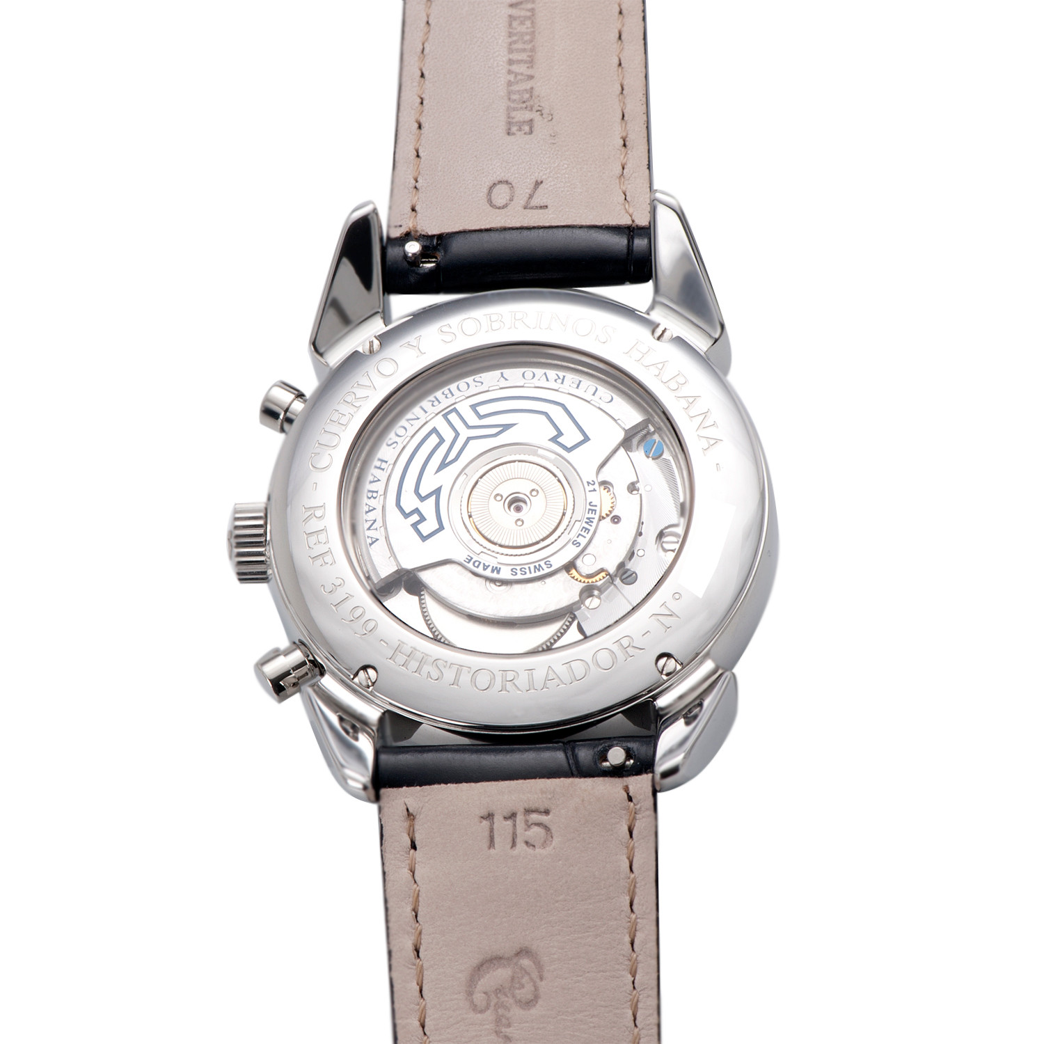 This new Cuervo y Sobrinos Historiador Cronografo watch is a classic, yet sporty, timepiece of distinction. It possesses a Swiss automatic movement and features Caliber DD 2099/2892-A2, 45 jewels, and a 37-hour power reserve. The screw-in sapphire crystal exhibition case back allows one to witness the intricate workings of the movement. This exquisite timepiece is water resistant to 30 m / 3 atm and it rests upon a black Louisiana alligator leather strap with a push-button deployant clasp.
