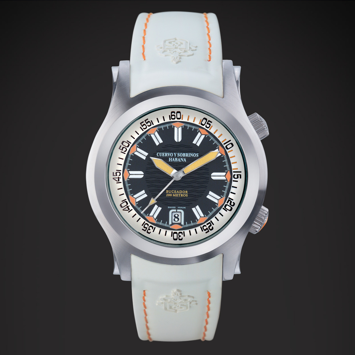 This sporty and brand new Cuervo y Sobrinos Robusto Buceador unisex diver’s watch will make a wonderful addition to your collection. The round stainless steel case is numbered and measures 43 mm in diameter (excluding crowns and lugs) and is 16.5 mm in height. It features screw-down crowns, a solid screw-in case back and the watch has an impressive water resistance to 200 m / 20 atm. The white-colored rubber strap with orange stitching has a stainless steel deployant buckle engraved with the Cuervo y Sobrinos insignia.