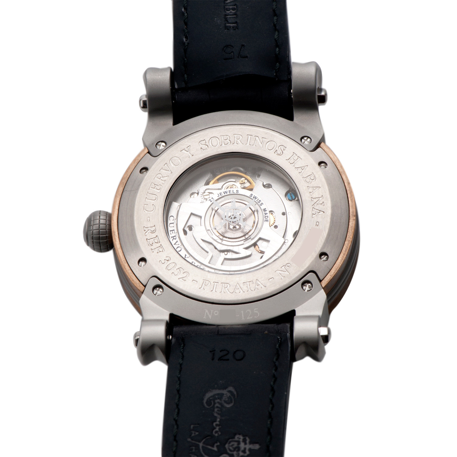 This new Cuervo y Sobrinos Torpedo Caribeno GMT Pirata men’s automatic watch is a stunning, unique timepiece that recalls a time when pirates and corsairs roamed the Caribbean. A gorgeous watch, to be sure, it is one of only 125 watches produced in a highly limited-edition series. It possesses a self-winding automatic movement, and it features the ETA 2893-A2 caliber, 25 jewels, 28,800 vph, and a 42-hour power reserve.