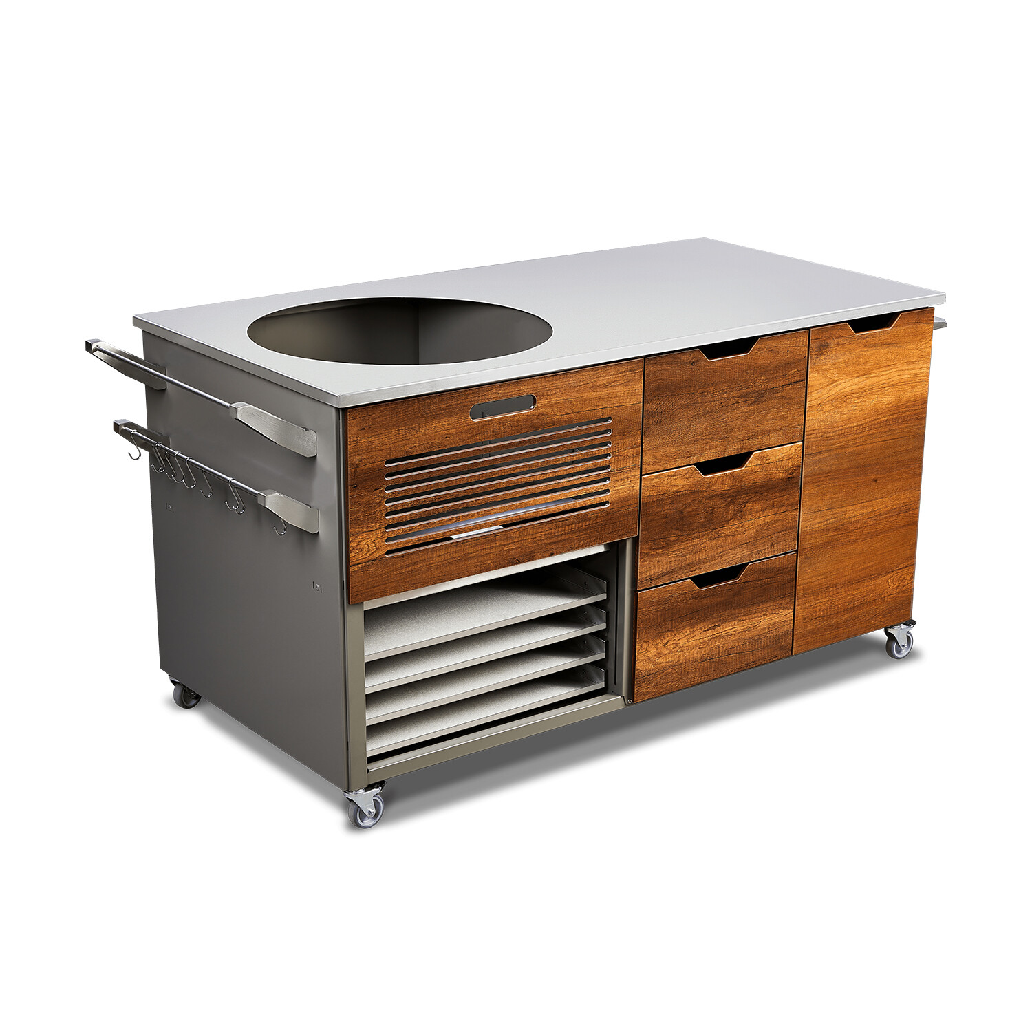 Kamadospace Infinite Island is an outdoor cooking island for your Kamado grill. The worktop is made of carefully polished, acid-proof stainless steel that is resistant to heat and is easy to clean and maintain. The door and drawer panels are made of extremely weather-resistant, easy to clean, high-pressure laminate. The table has four drawers for spacious accessories like a cast iron grate, a pizza stone, deflector, or a baking tray. There is a kitchen towel holder, a holder with 10 hooks for hanging accessories, and an herb pot shelf.