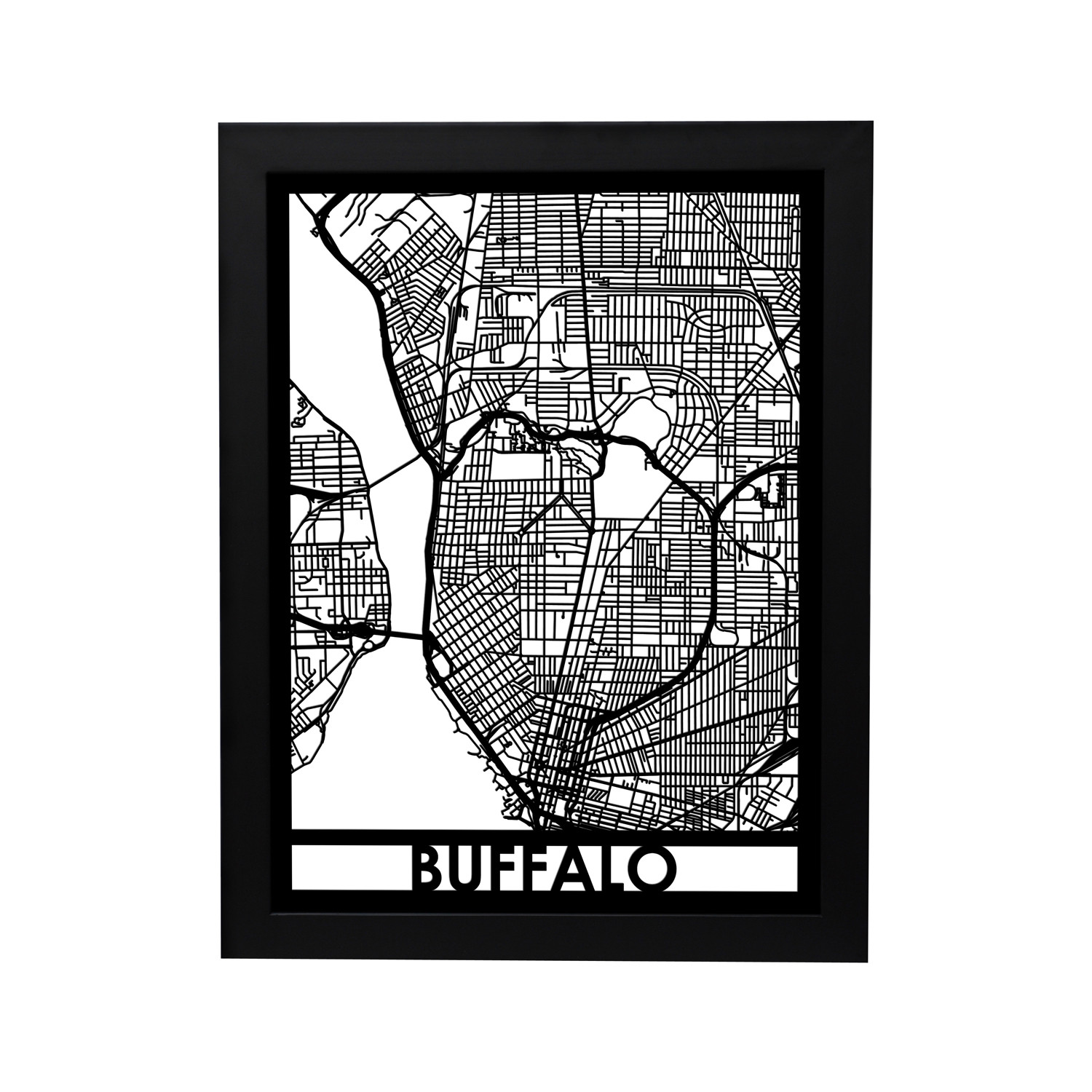 Celebrate Buffalo with this machined map. This highly detailed street map is made of high density EVA foam, and was cut with CNC precision machinery for a stunning, perfect silhouette. It's framed and ready to hang in your home, with black and white contrast providing a background for you to trace every road and river in your favorite city of all time.