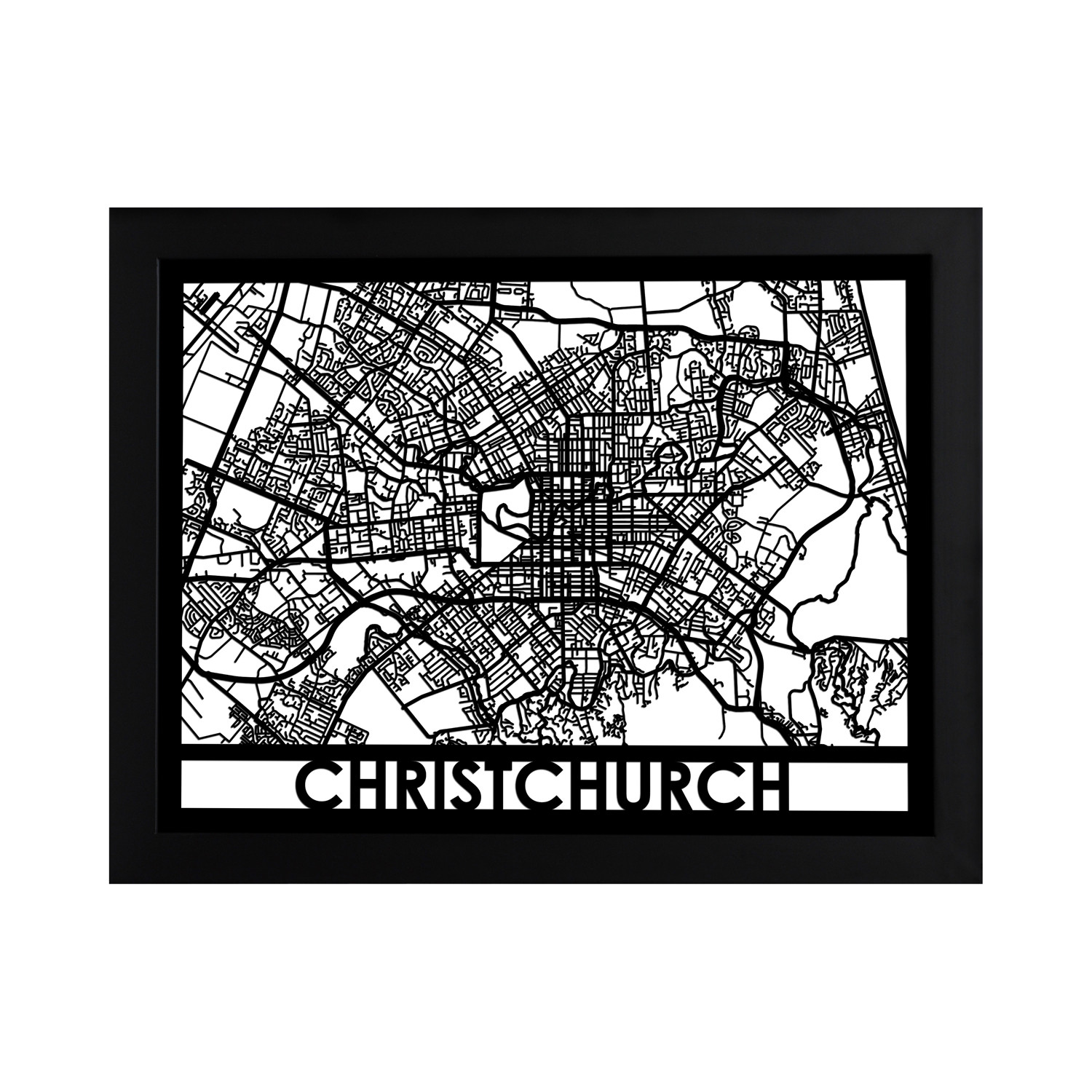 Celebrate Christchurch with this machined map. This highly detailed street map is made of high density EVA foam, and was cut with CNC precision machinery for a stunning, perfect silhouette. It's framed and ready to hang in your home, with black and white contrast providing a background for you to trace every road and river in your favorite city of all time.