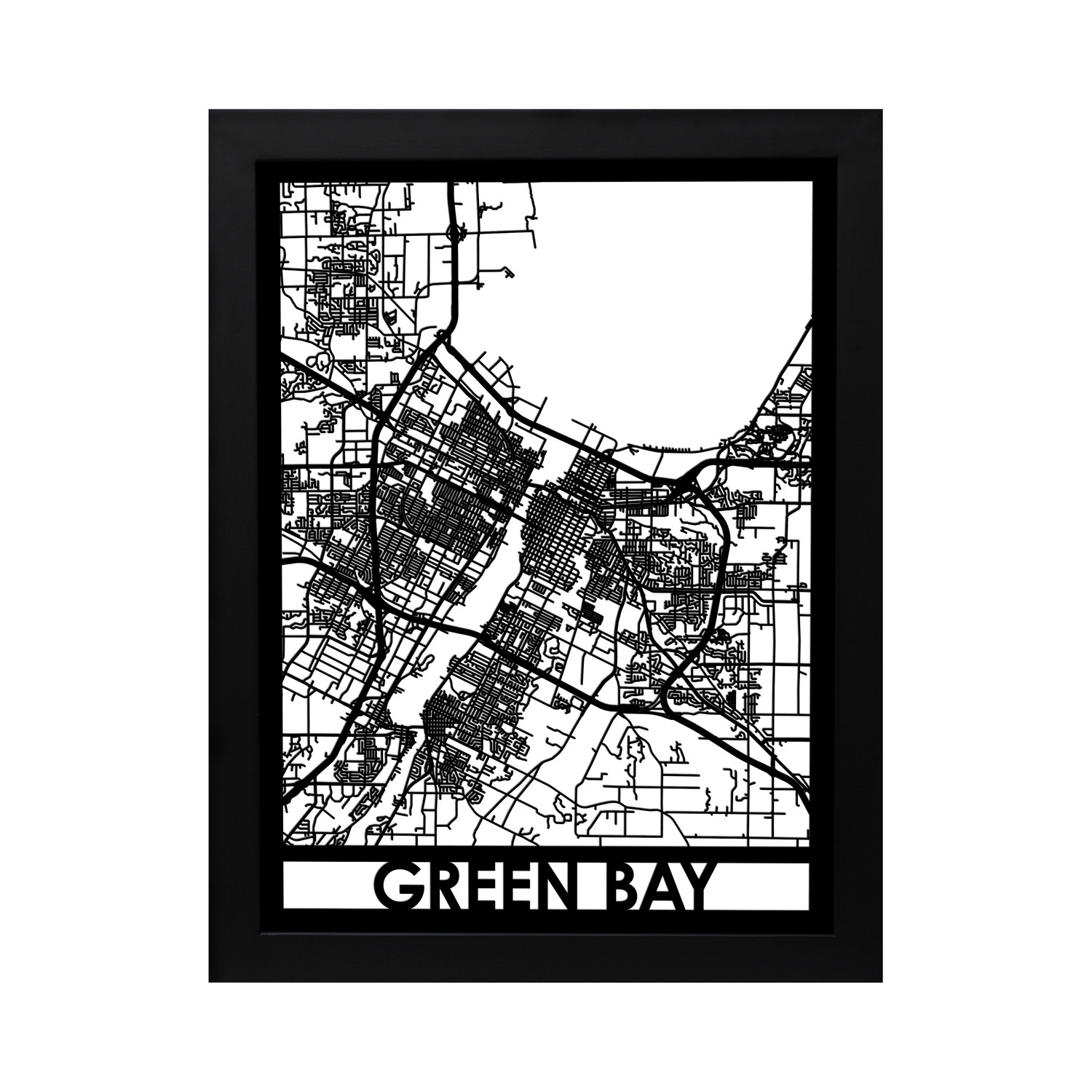 Celebrate Green Bay with this machined map. This highly detailed street map is made of high density EVA foam, and was cut with CNC precision machinery for a stunning, perfect silhouette. It's framed and ready to hang in your home, with black and white contrast providing a background for you to trace every road and river in your favorite city of all time.