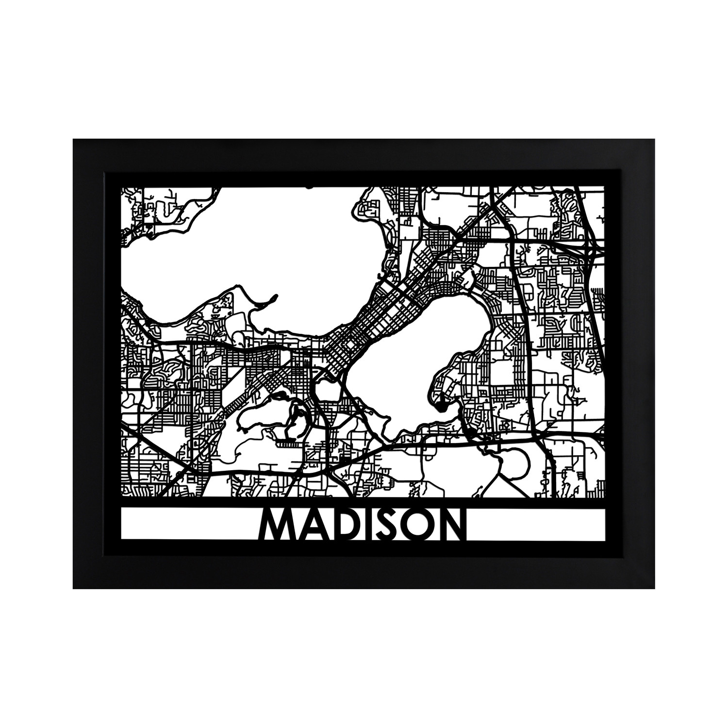 Celebrate Madison with this machined map. This highly detailed street map is made of high density EVA foam, and was cut with CNC precision machinery for a stunning, perfect silhouette. It's framed and ready to hang in your home, with black and white contrast providing a background for you to trace every road and river in your favorite city of all time.