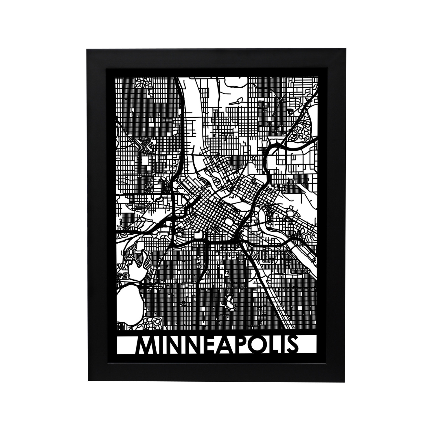 Celebrate Minneapolis with this machined map. This highly detailed street map is made of high density EVA foam, and was cut with CNC precision machinery for a stunning, perfect silhouette. It's framed and ready to hang in your home, with black and white contrast providing a background for you to trace every road and river in your favorite city of all time.