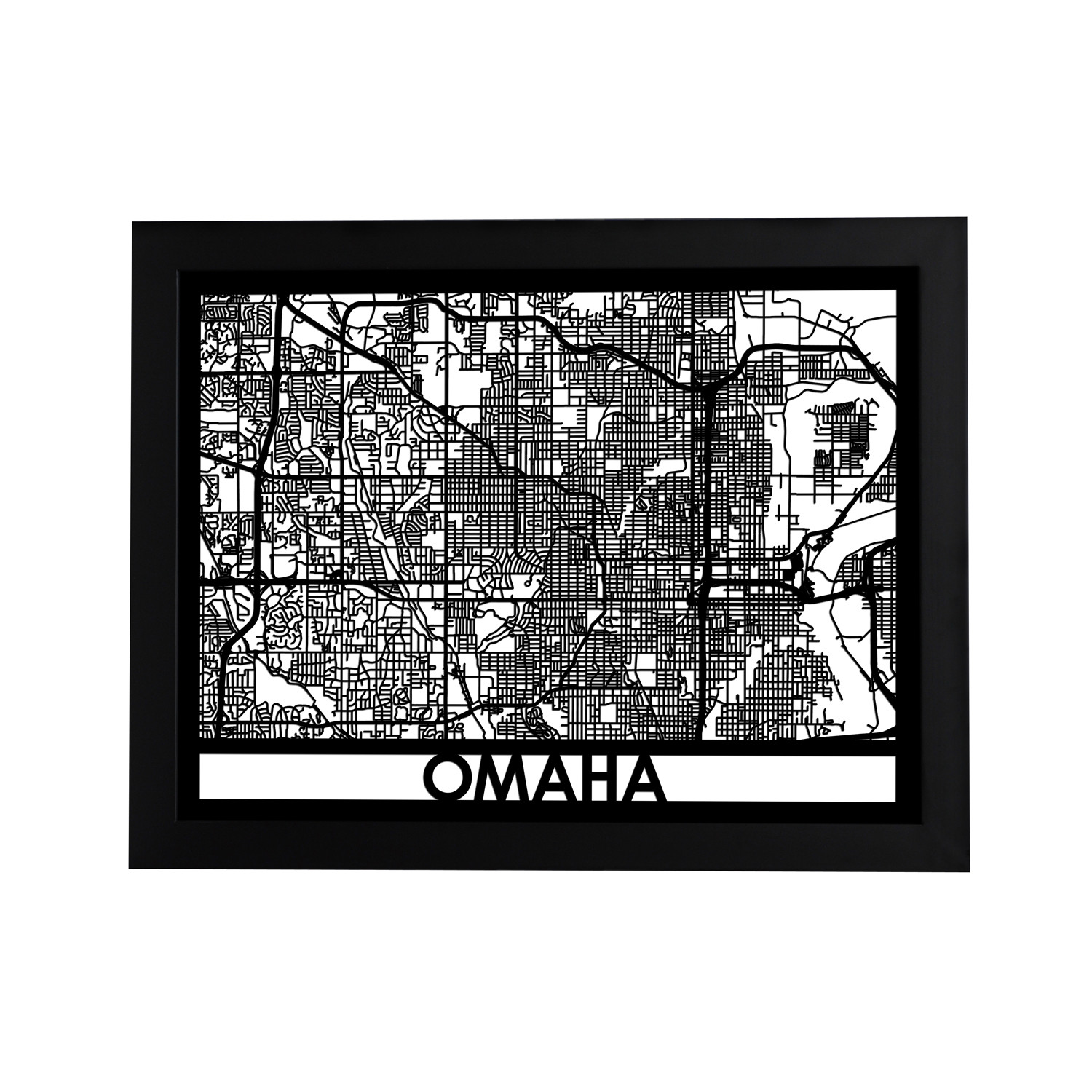 Celebrate Omaha with this machined map. This highly detailed street map is made of high density EVA foam, and was cut with CNC precision machinery for a stunning, perfect silhouette. It's framed and ready to hang in your home, with black and white contrast providing a background for you to trace every road and river in your favorite city of all time.