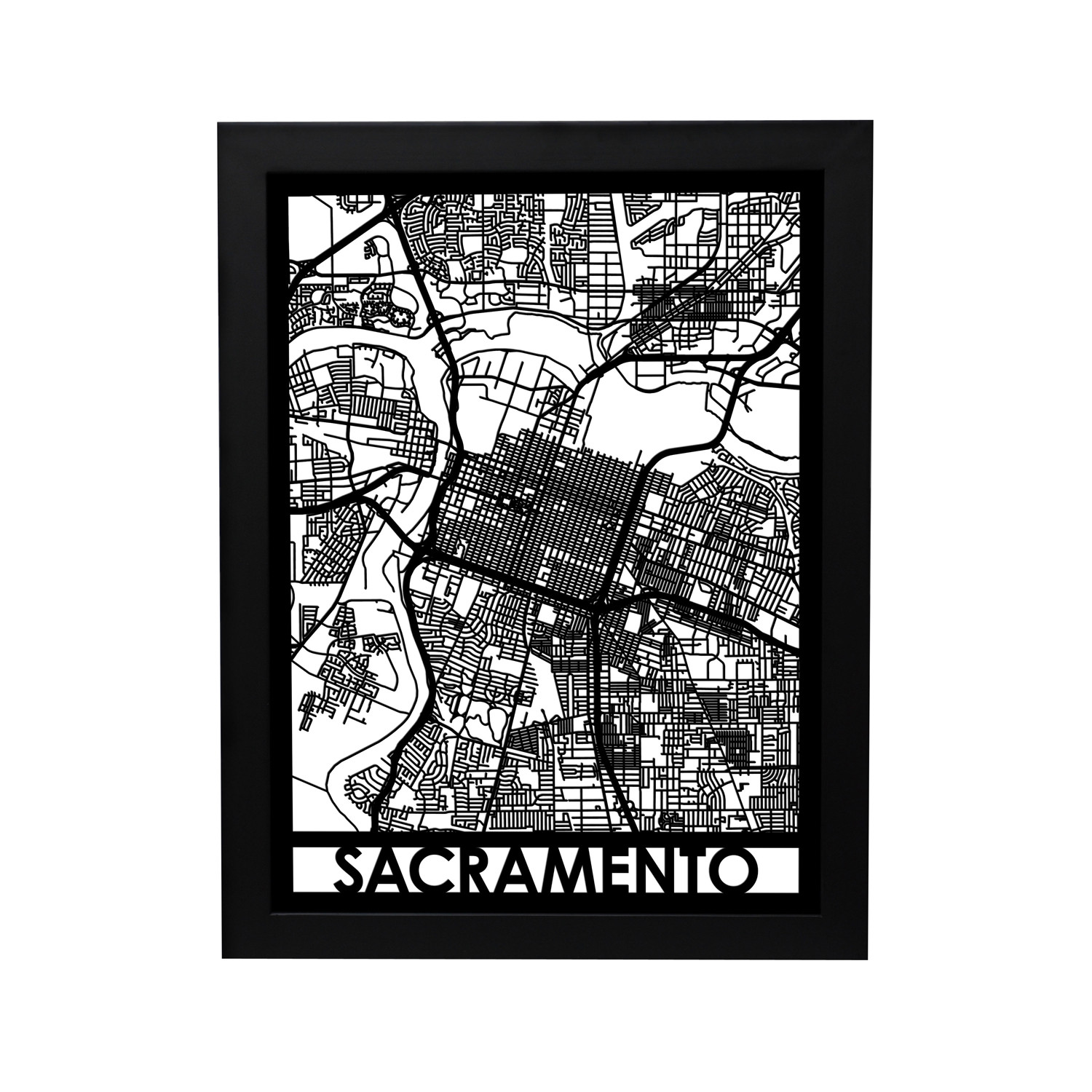 Celebrate Sacramento with this machined map. This highly detailed street map is made of high density EVA foam, and was cut with CNC precision machinery for a stunning, perfect silhouette. It's framed and ready to hang in your home, with black and white contrast providing a background for you to trace every road and river in your favorite city of all time.