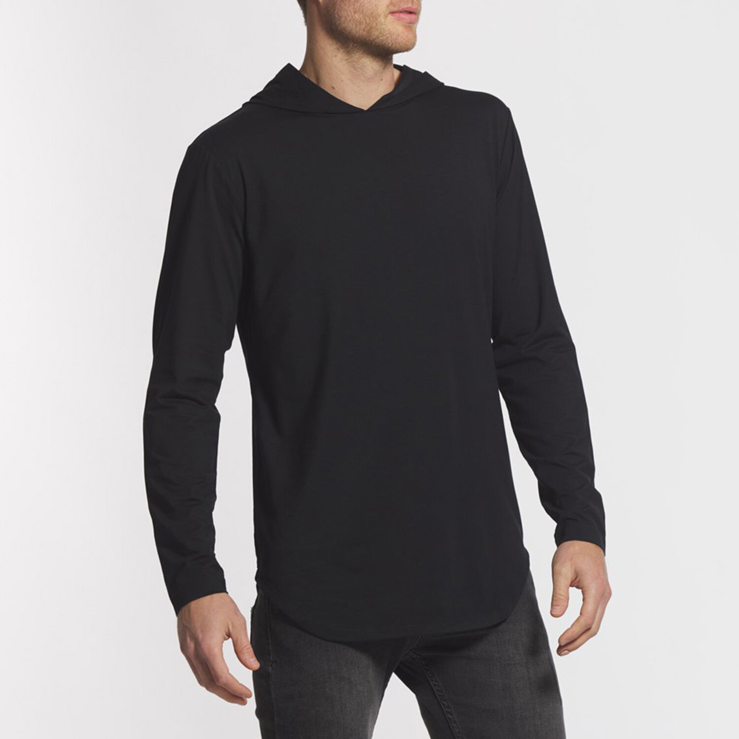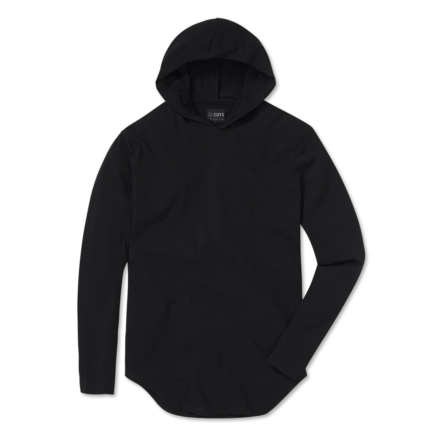 The custom long-sleeve hooded shirt paired with an Elongated bottom Cut gives this style extra length great for layering.