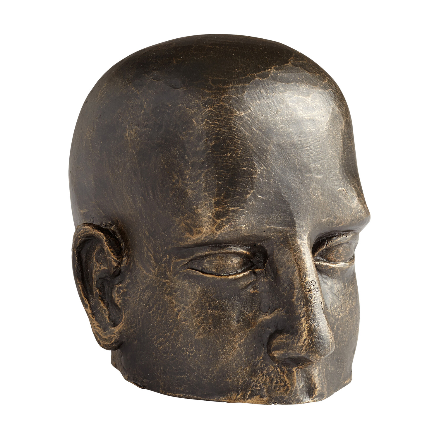 An arrestingly modern interpretation of a bust style artwork gives this face focused sculpture an unusual bearing. Old world finished iron highlights intriguing elements and the depths of shadow and light.