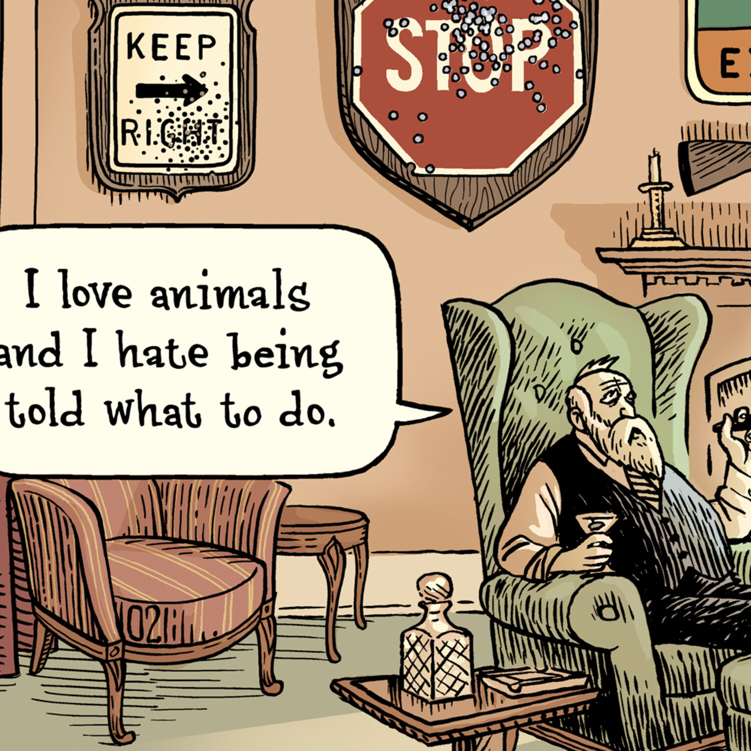 Dan Piraro is a painter, illustrator, and cartoonist best known for his critically-acclaimed comic Bizarro. His single panel gems are a unique concoction of surrealistic imagery, commentary, and witty plays on words. A combination of his own real-life situations and eccentric thoughts, Piraro's humor won Bizarro the "Best Panel Feature" from the National Cartoonists Society for three consecutive years: 2002, 2003, 2004, and once more in 2016. He also one "Cartoonist of the Year" in 2009. This collection of limited edition cartoon prints commemorates Piraro's Bizarro throughout the years.
