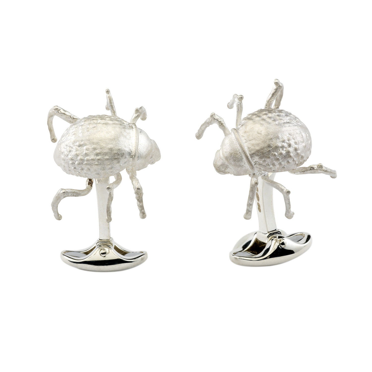 The world's only tok tokkie beetle cufflinks have the finest crafted details to show their spiky shell and bendy knees. The tok tokkie is a common name for all beetles which produce a "tokking" sound when tapping their abdomen against the ground. Native to Africa, these interesting creatures will look superb on your cuff.