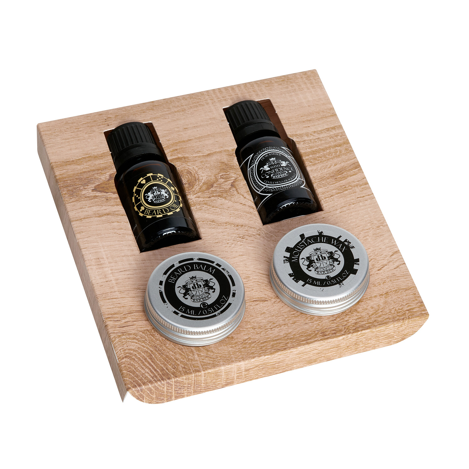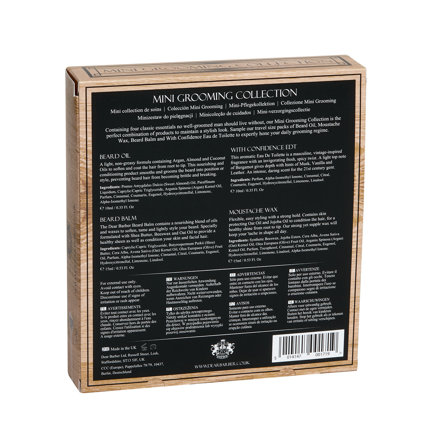 With the perfect combination of four mini products that will revolutionize your grooming regime, The Mini Grooming Collection will undoubtedly provide your facial hair with a stylish healthy sheen and leave you smelling fantastic with a splash of the Dear Barber signature scent. This Mini Grooming range is made up of Beard Balm, Moustache Wax, Beard Oil and Dear Barber's signature fragrance, 'With Confidence’.