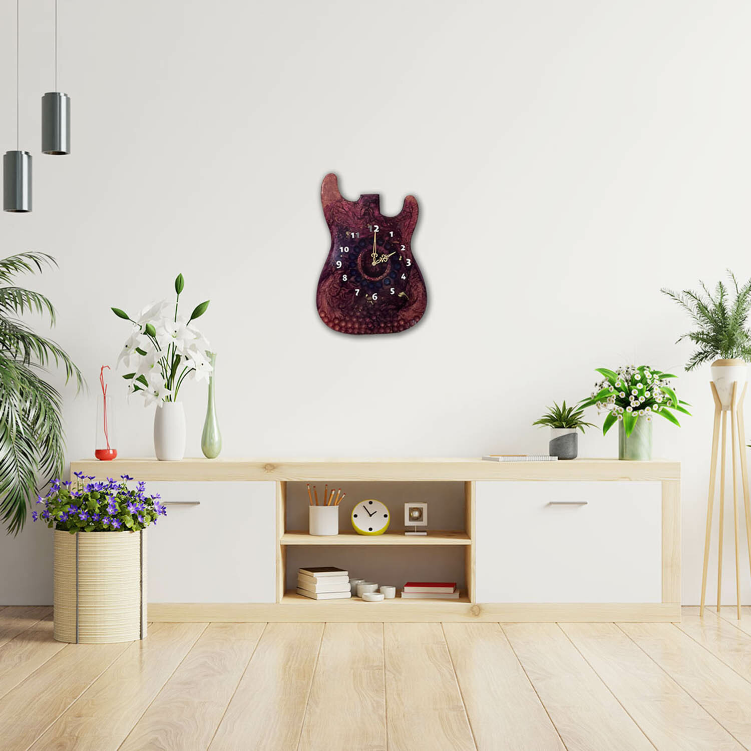 Best known for her poured acrylic paintings and epoxy work, Philadelphia-born artist Deb Cikovic utilizes a multitude of techniques to create pieces that mean something different to every individual's minds eye. This collection of wall art is a striking example of Cikovic's creative vision and skill infused with a nod to rock n' roll. Modeled after the famous Fender Stratocaster Guitar, this custom-made, one-of-a-kind wall clock features a multiple shiraz swirl motif with white numbers and a smooth, battery-powered movement.
