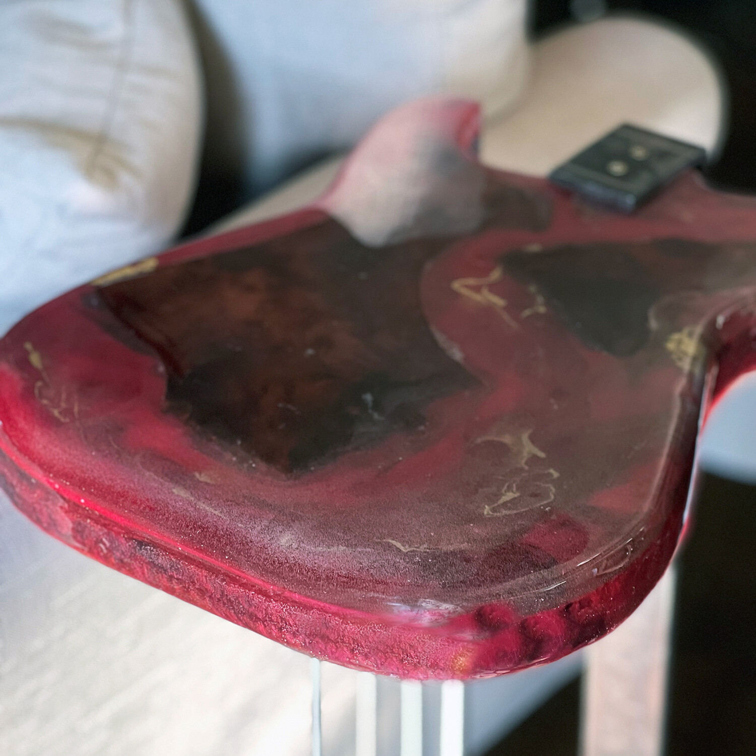 This is a unique, one of a kind Fender Stratocaster Guitar Table featuring dramatic mica colors in cranberry with redwood inserts and gold swirls. This table has a custom-made sturdy steel stand made in the fret-board style. It is food safe and sealed for long-lasting use.