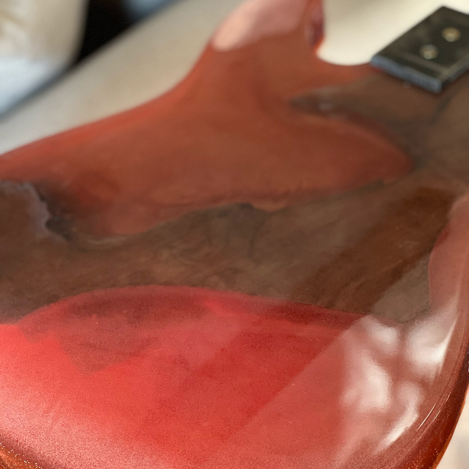 This is a unique, one of a kind Fender Telecaster Guitar Table featuring golden hues of bronze and tangerine mica colors, and inlaid wood. This table has a custom-made sturdy steel stand made in the fret-board style. It is food safe and sealed for long-lasting use.