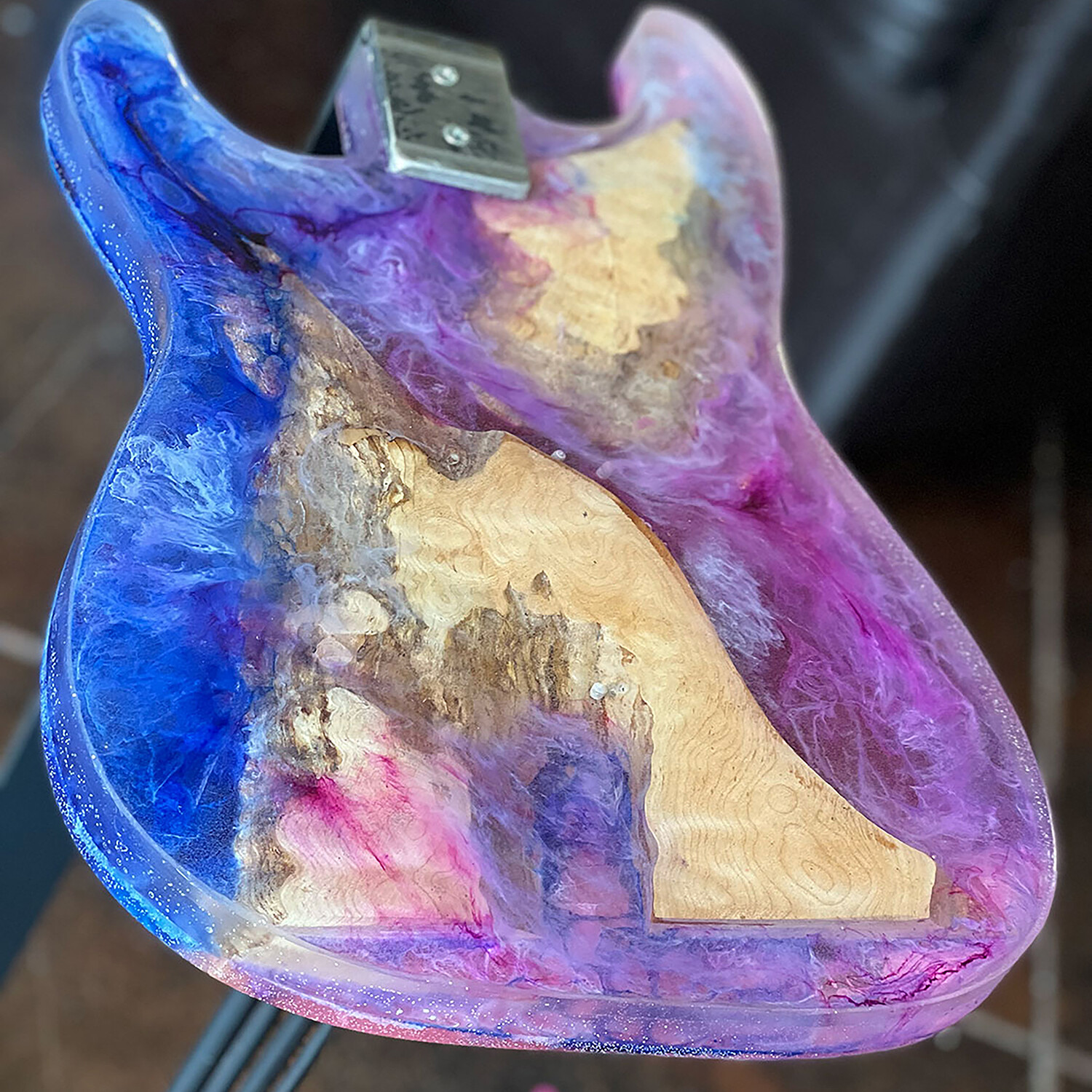 Philadelphia, Pennsylvania born artist Deb Cikovic is best known currently for her paintings in acrylic pouring as well as epoxy work, she uses a multitude of techniques and materials to create pieces that mean something to every individuals minds eye. This collection of epoxy Fender Telecaster and Stratocaster side tables are an example of Cikovic's creative vision and artistic skill and a nod to rock n' roll vibes.