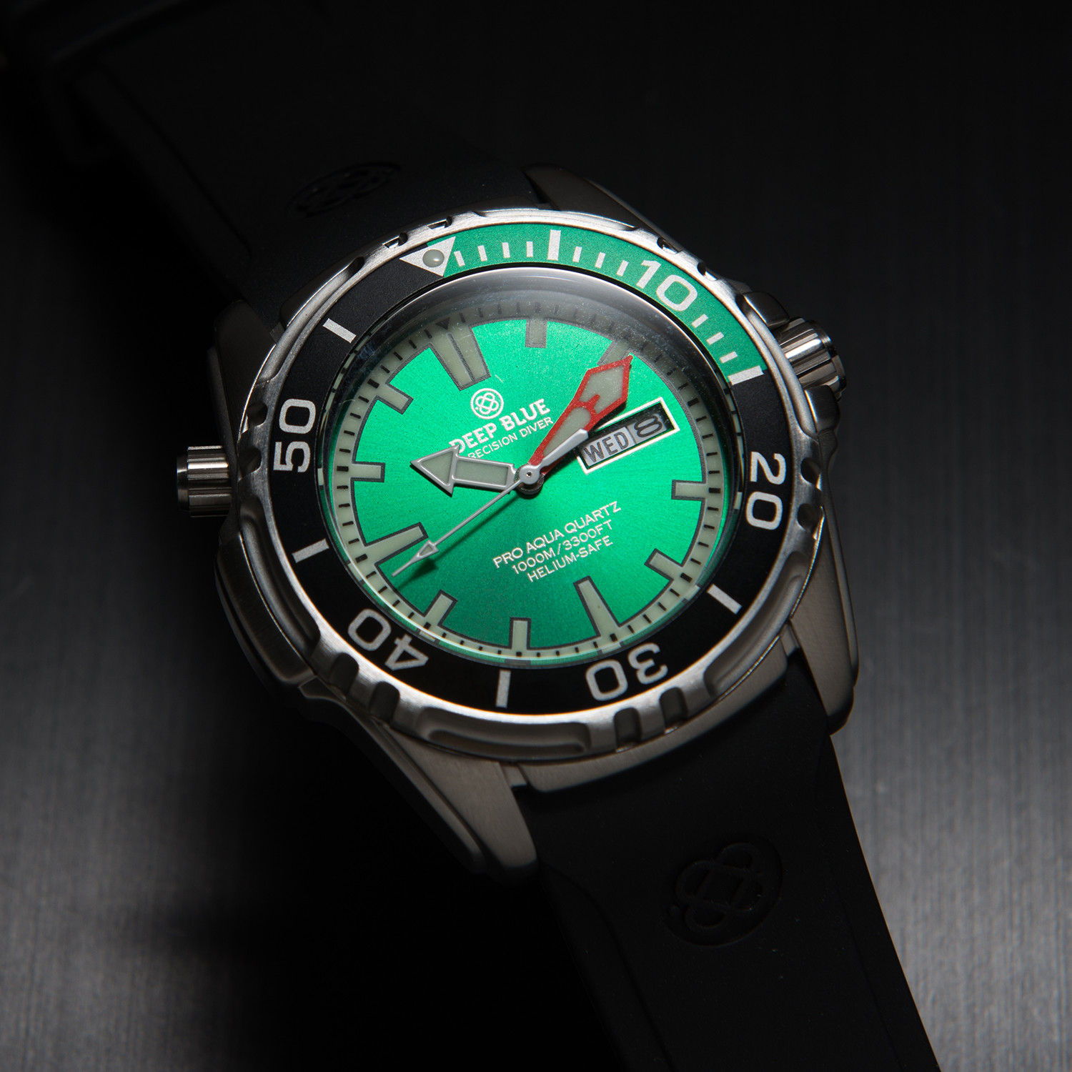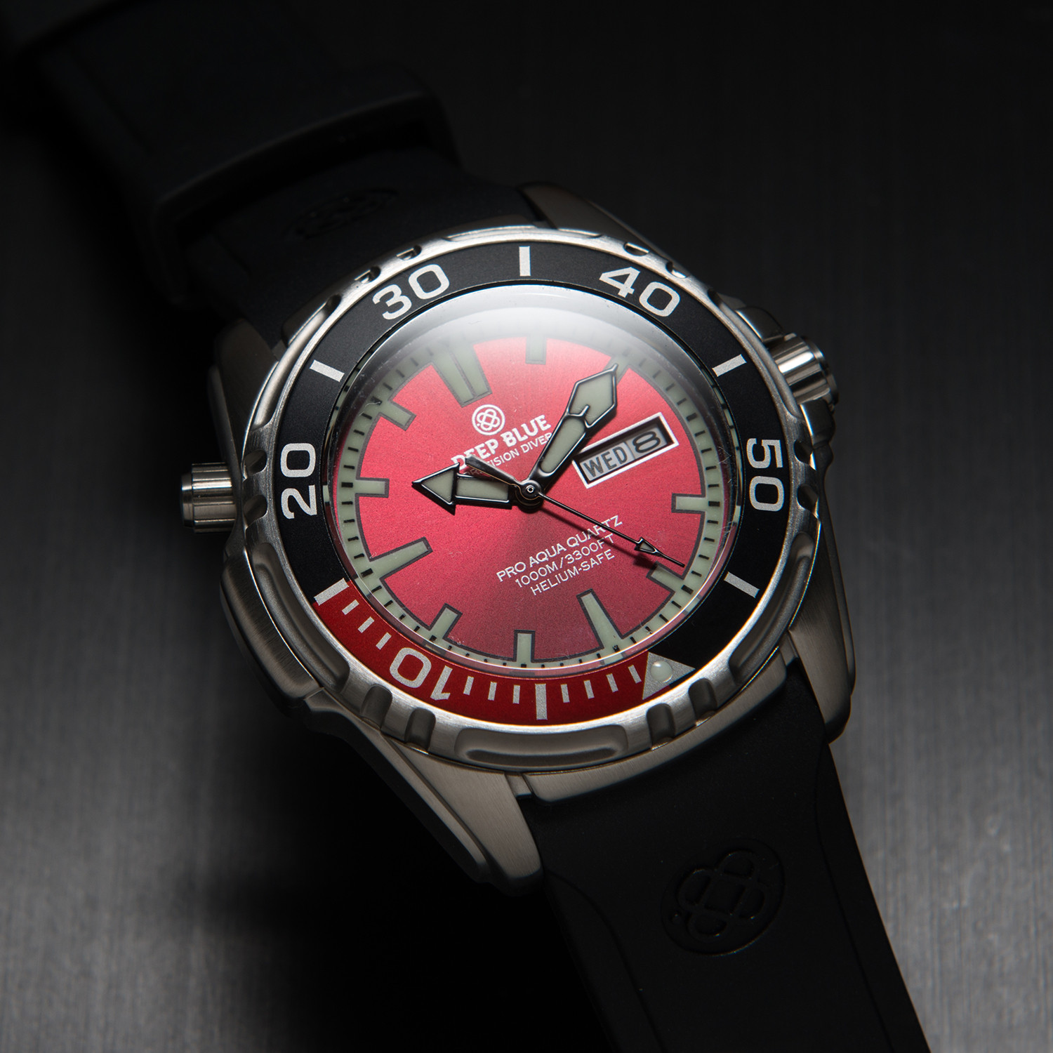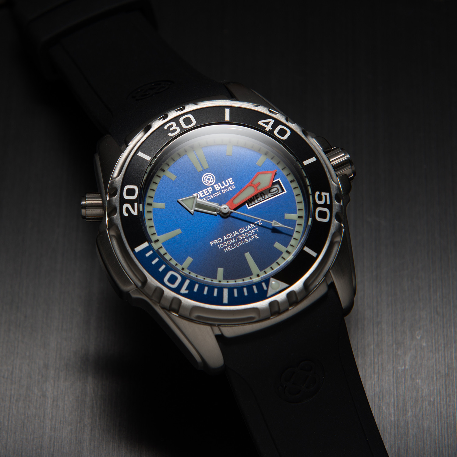 For the most extreme — saturation diving, or staying below water for extensive amounts of time — no watch but the ProAqua // 1/4 Bezel will do. With every extra detail from diver extension clasp to a hacking stop second device, it's an incredible tool for underwater treks.