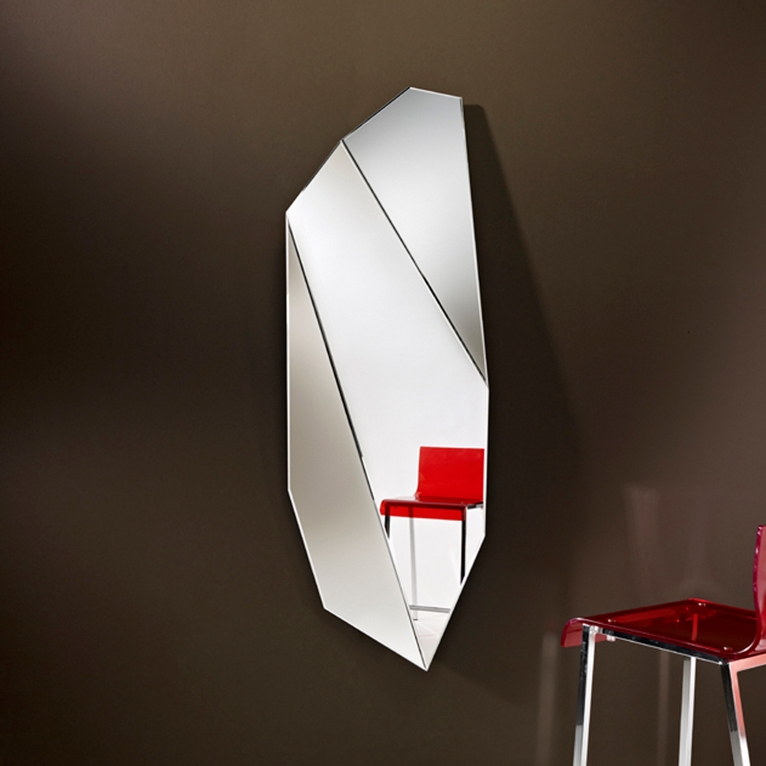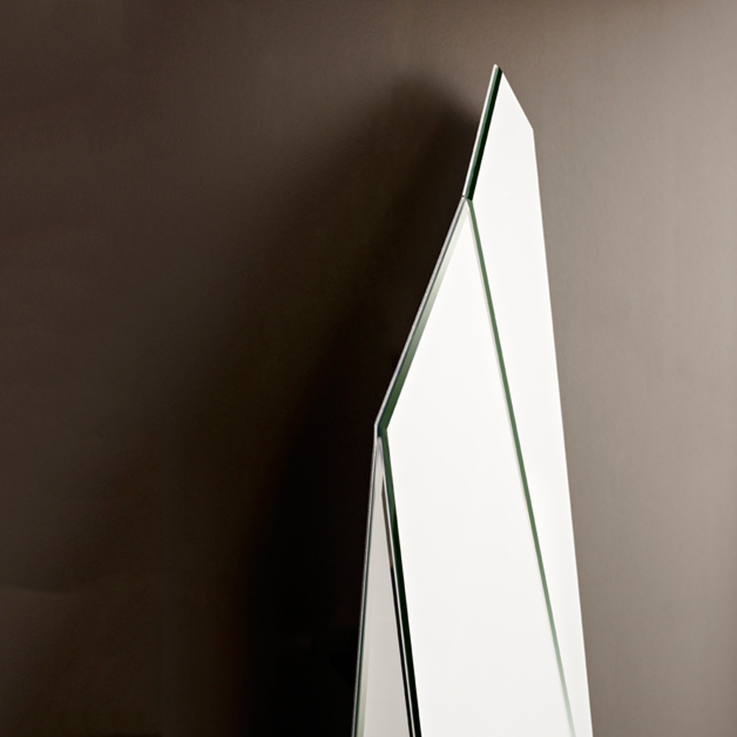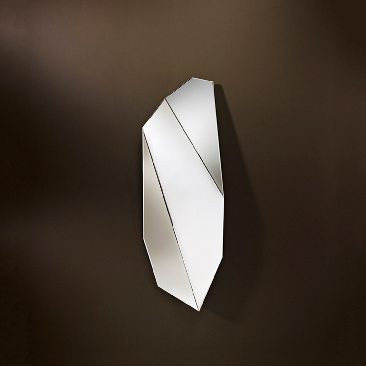 The Quartz L mirror is a mixture of solidity and refinement. Cut to bring to mind a a polished stone, it resembles the natural shape of the quartz mineral. The broken mirror surface creates a play of reflection, but the mirrors remains functional due to its straight middle part. With a fine-ground edge, its broken facet adds an unusual edge to any space.