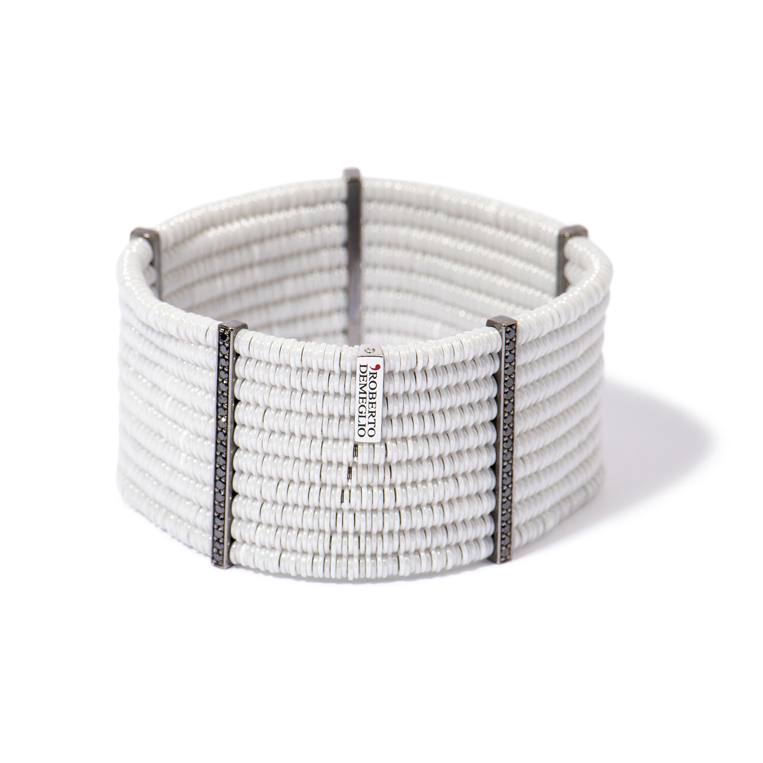 Completely modern with an art deco undertone, this collection by Roberto Demeglio is a new kind of luxury jewelry. Each piece is elevated yet playful, with stretch elements that make it comfortable and so easy to wear. A dramatic juxtaposition of white and black ceramic and silver and gold elements, you can be sure that whether for yourself or as a gift, this is true statement jewelry.