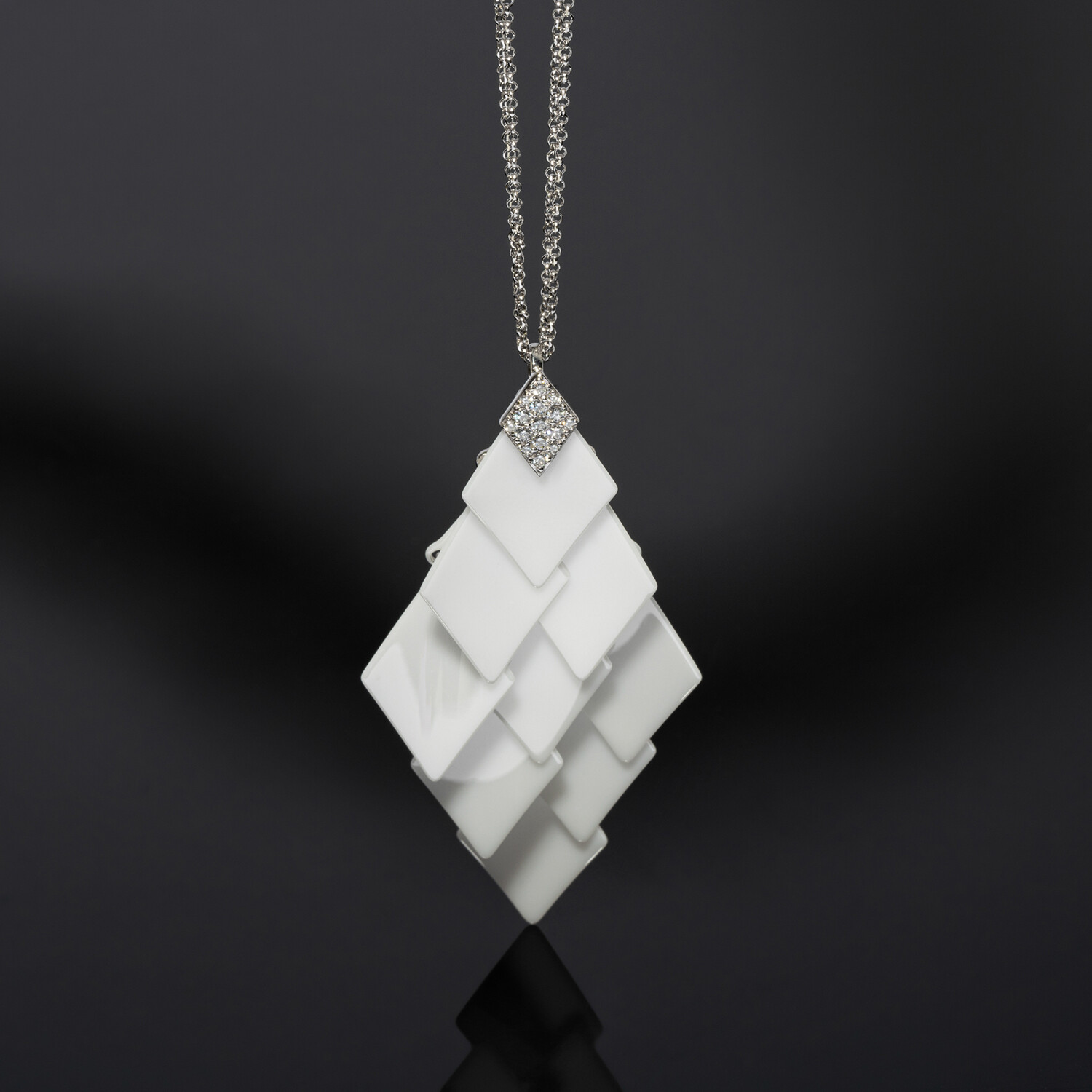 18k White Gold Diamond + White Ceramic Chandelier Pendant Necklace I // 16" // New