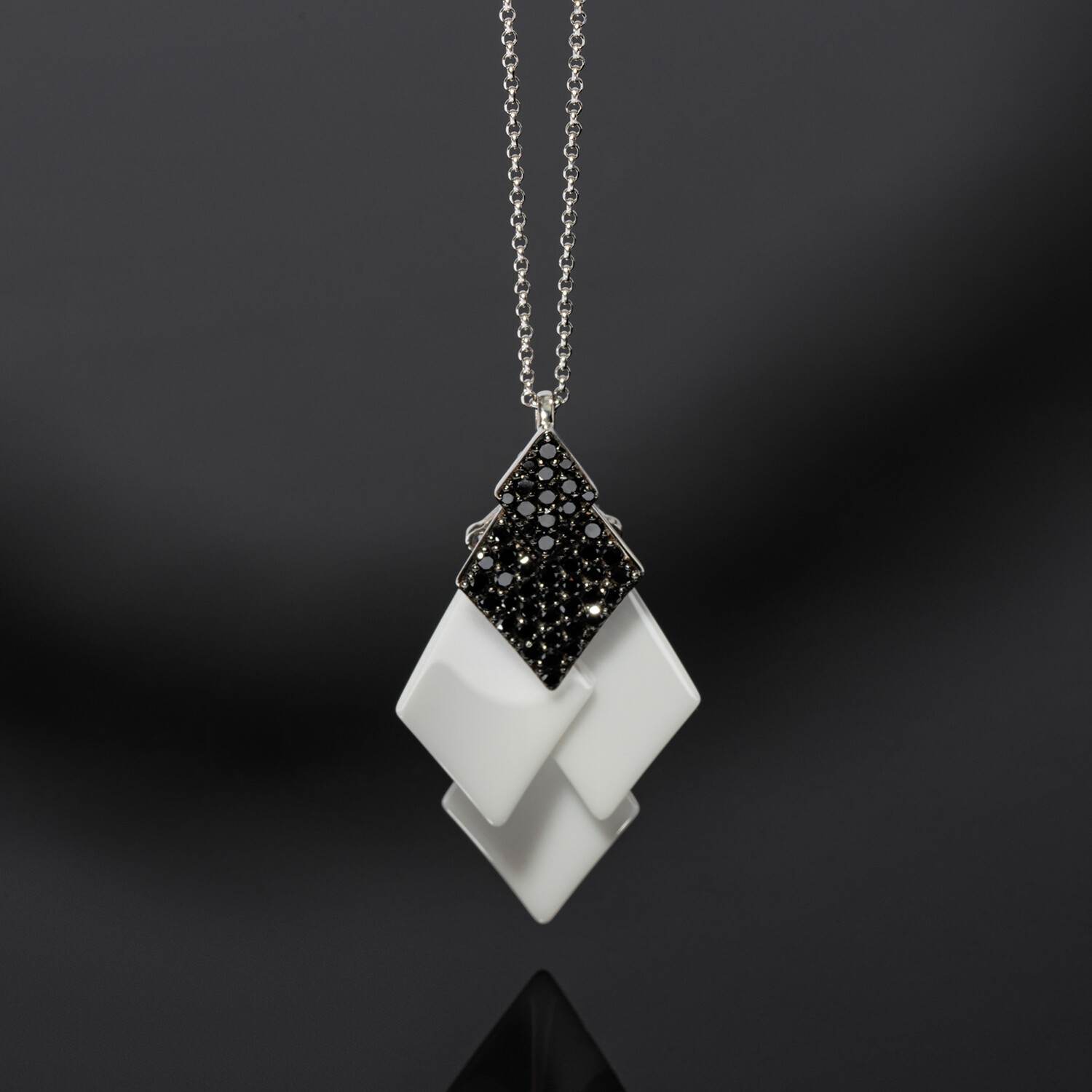 18k White Gold Diamond + White Ceramic Layered Pendant Necklace II // 16" // New