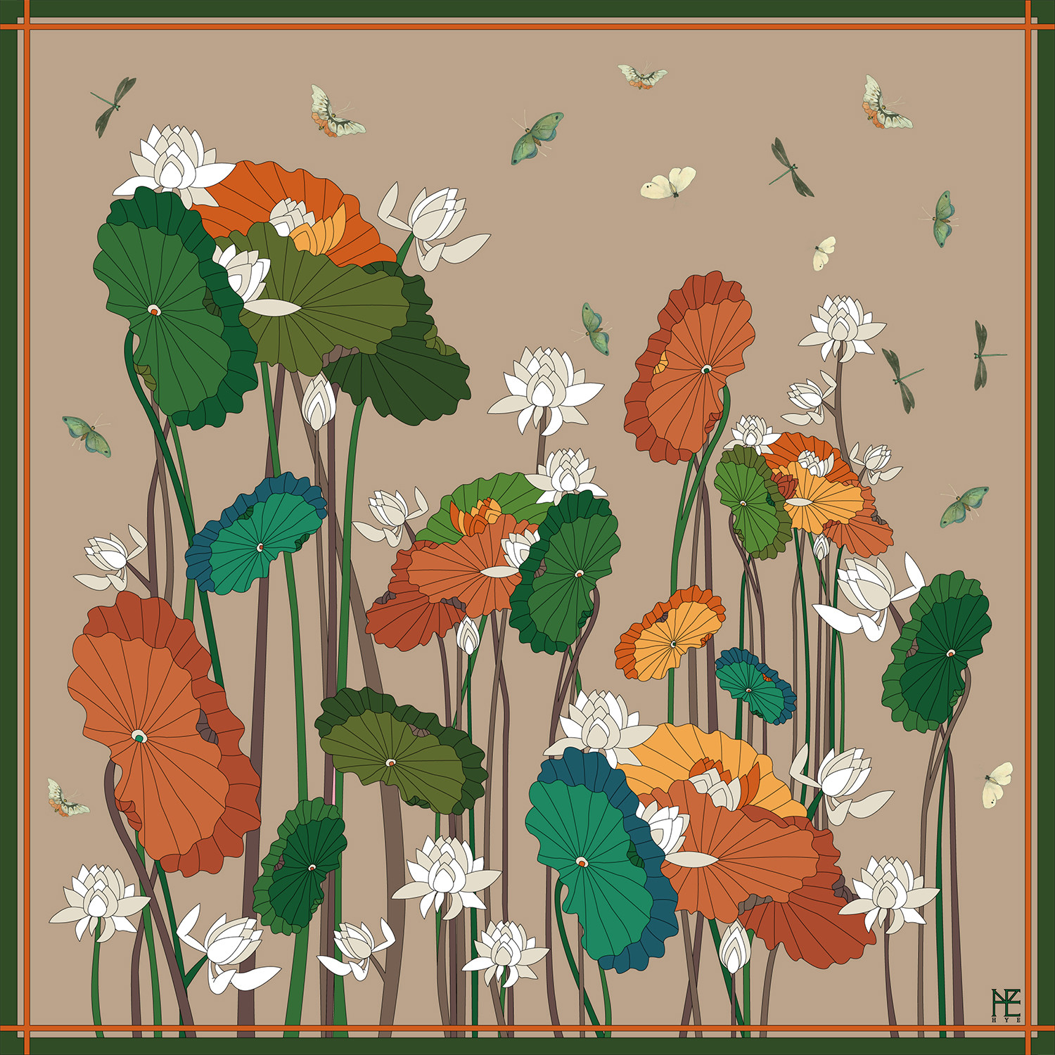 Lotus flowers represent great love and compassion in Buddhism. It is created in the 19th century style of folk painting with butterflies which symbolize joy, happiness and hope.