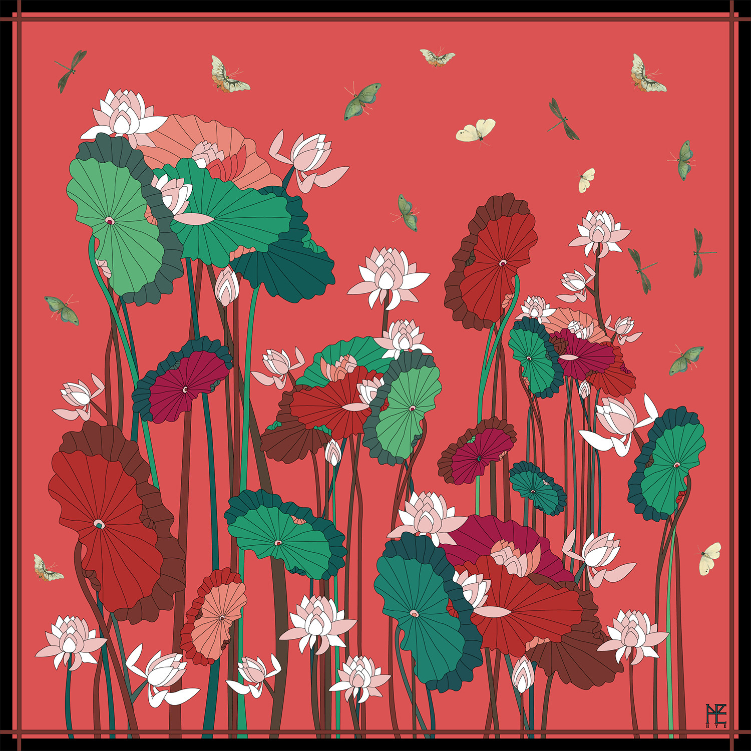 Lotus flowers represent great love and compassion in Buddhism. It is created in the 19th century style of folk painting with butterflies which symbolize joy, happiness and hope.