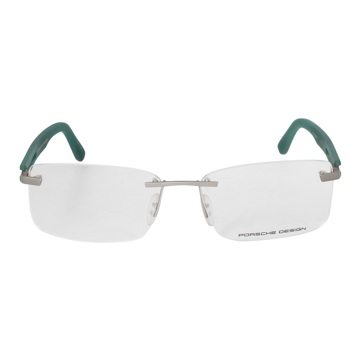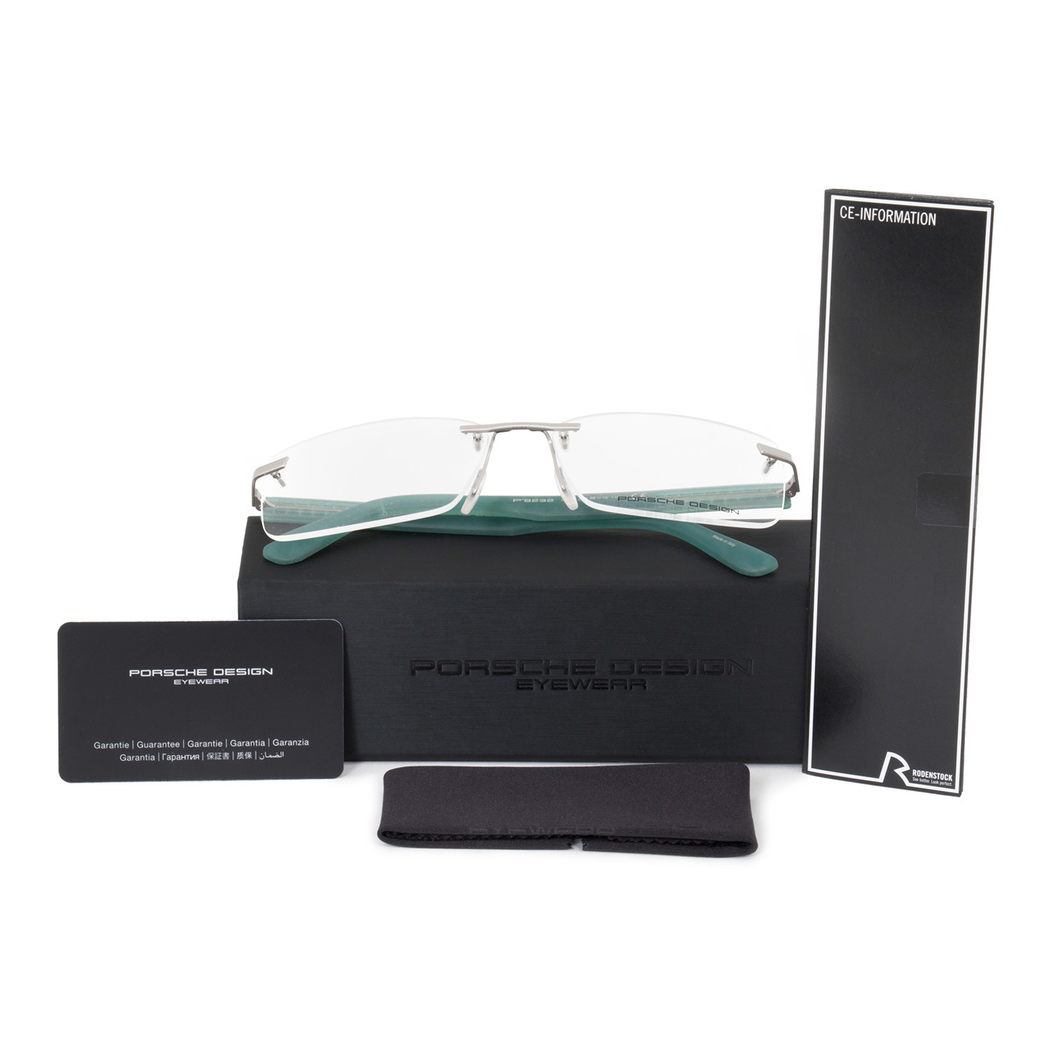 Look sleek and sophisticated in these sporty Porsche P8232 E eyeglasses for men. The rimless rectangular lenses have a straight metallic silver bridge silver hinges and matte blue-green arms coated with a supple smooth rubberized finish. The Porsche Design logo is inscribed at the temple. These authentic designer eyeglasses measure 59-16-140 mm and ship with the Porsche lens case and lens cleaning cloth.