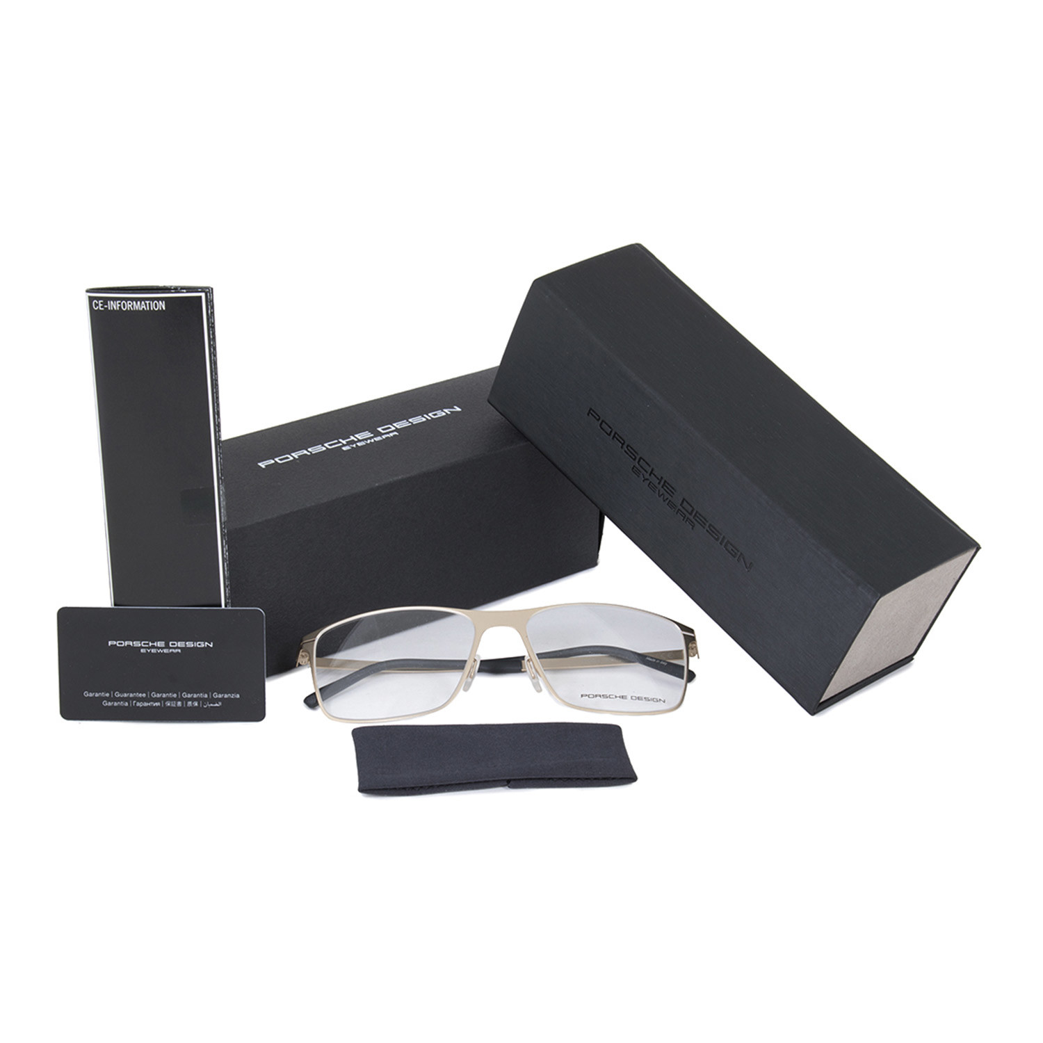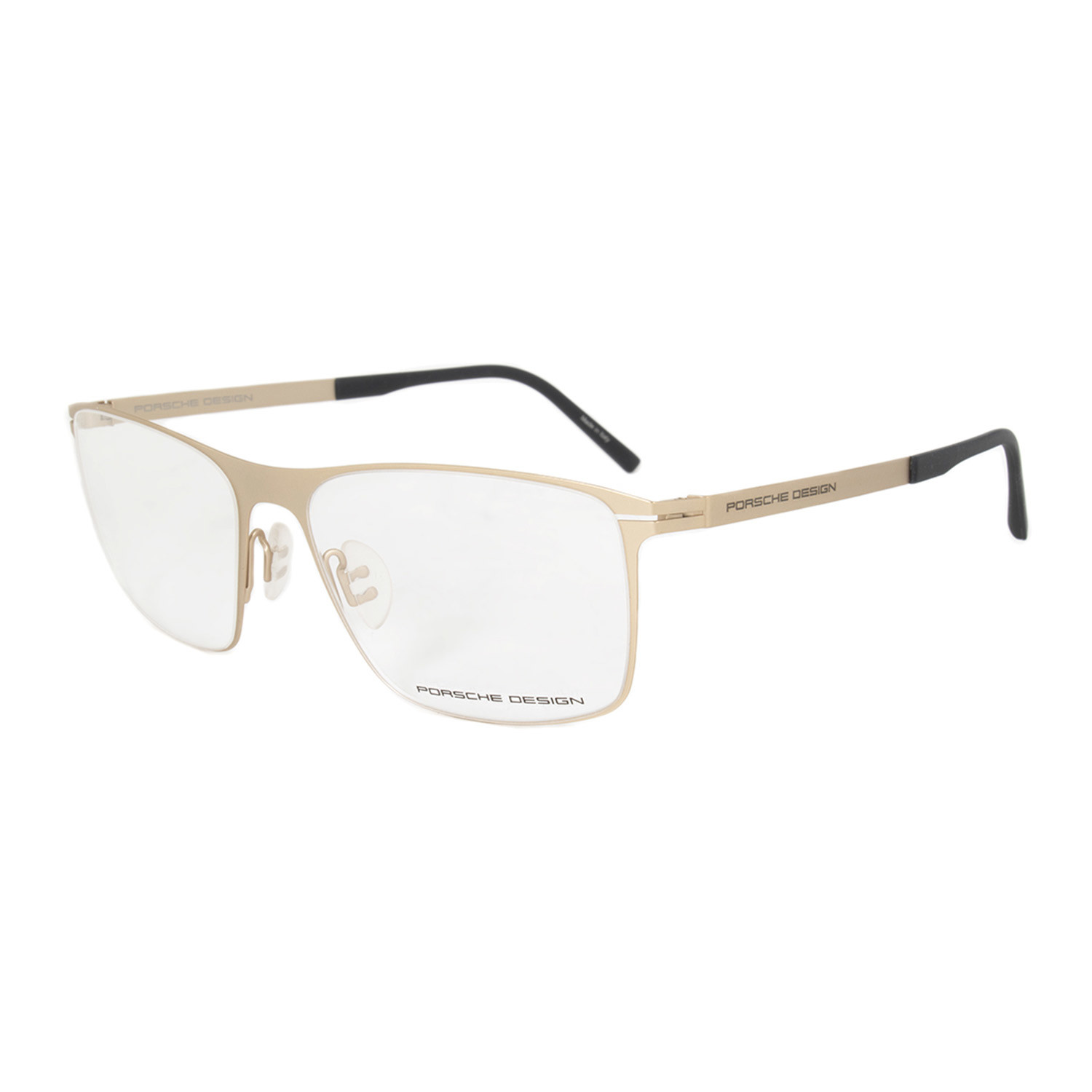 Look sleek and sophisticated in these sporty Porsche P8256 B eyeglasses for men. The elegant square frames bridge and hinges are made with Titanium in matte light gold. The slim Titanium arms are coated with smooth matte black rubberized plastic with the Porsche Design logo inscribed at the temple. These authentic designer eyeglasses measure 55-16-140 mm and ship with the Porsche lens case and lens cleaning cloth.