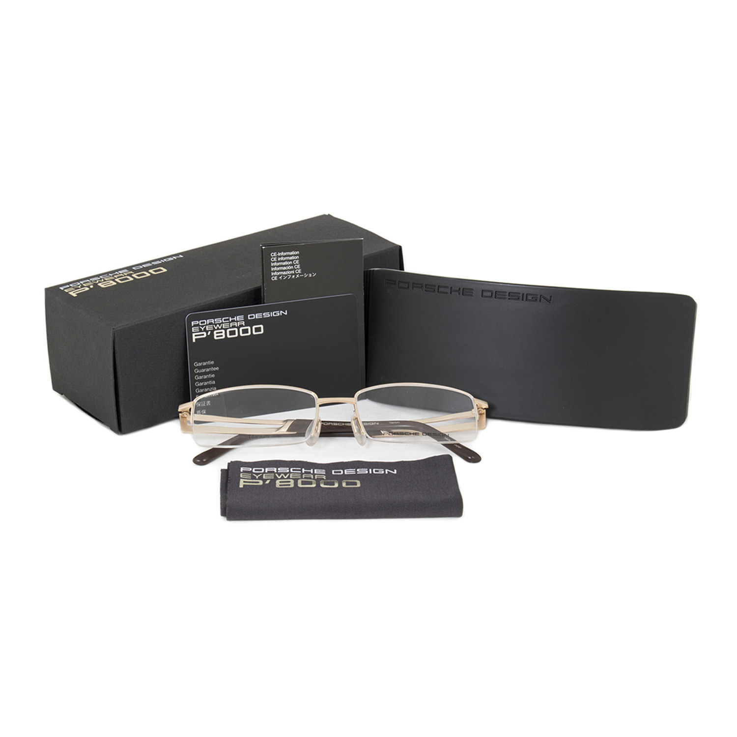 Look sleek and sophisticated in these sporty Porsche P8703 B eyeglasses for men. The rectangular frames are rimless at the bottom and rimmed in matte gold Titanium along the top half through the single bridge and hinges. The slender matte gold Titanium arms have the Porsche Design logo inscribed at the temple and are tipped with matte brown acetate at the ends. These authentic designer eyeglasses measure 56-18-145 mm and ship with the Porsche lens case and lens cleaning cloth.