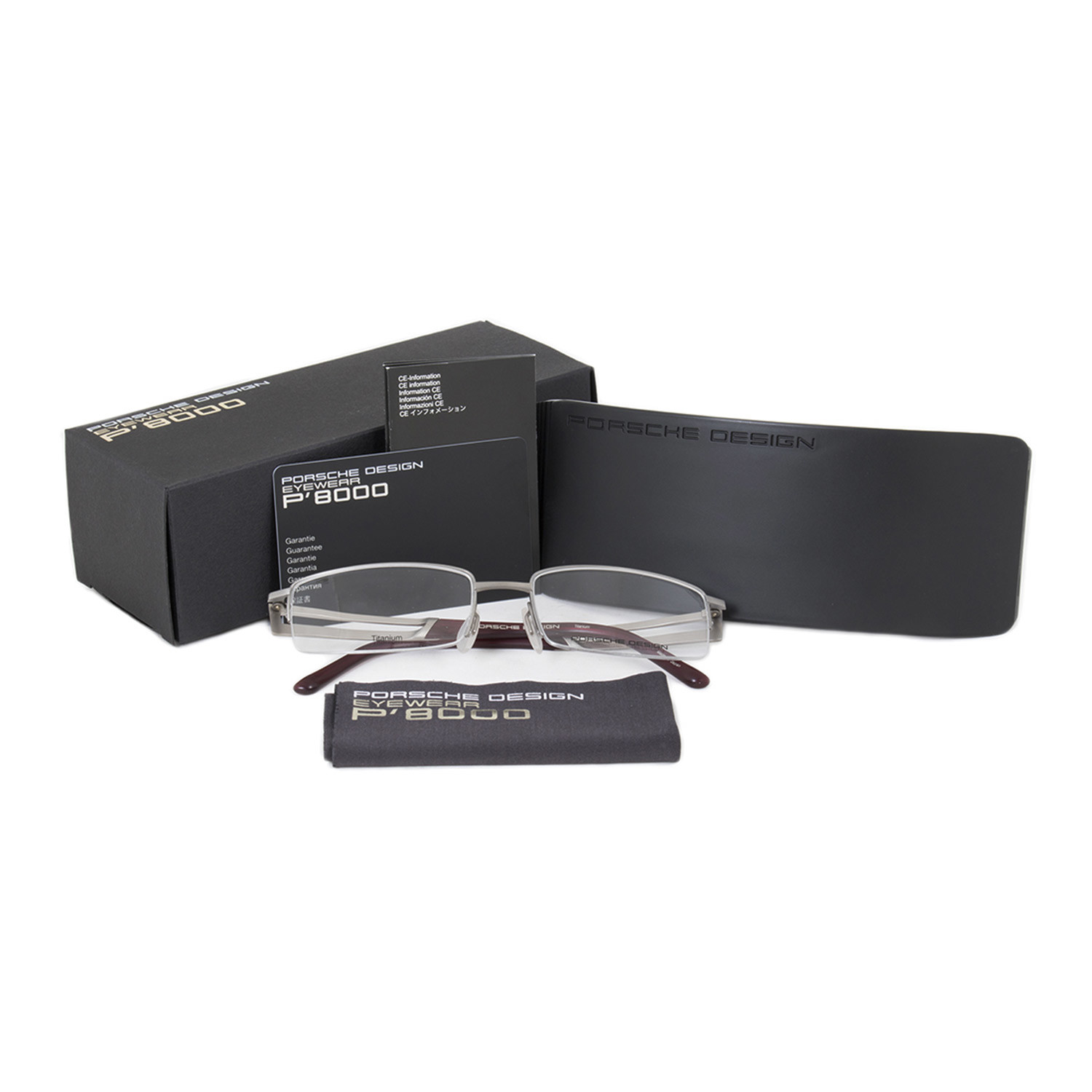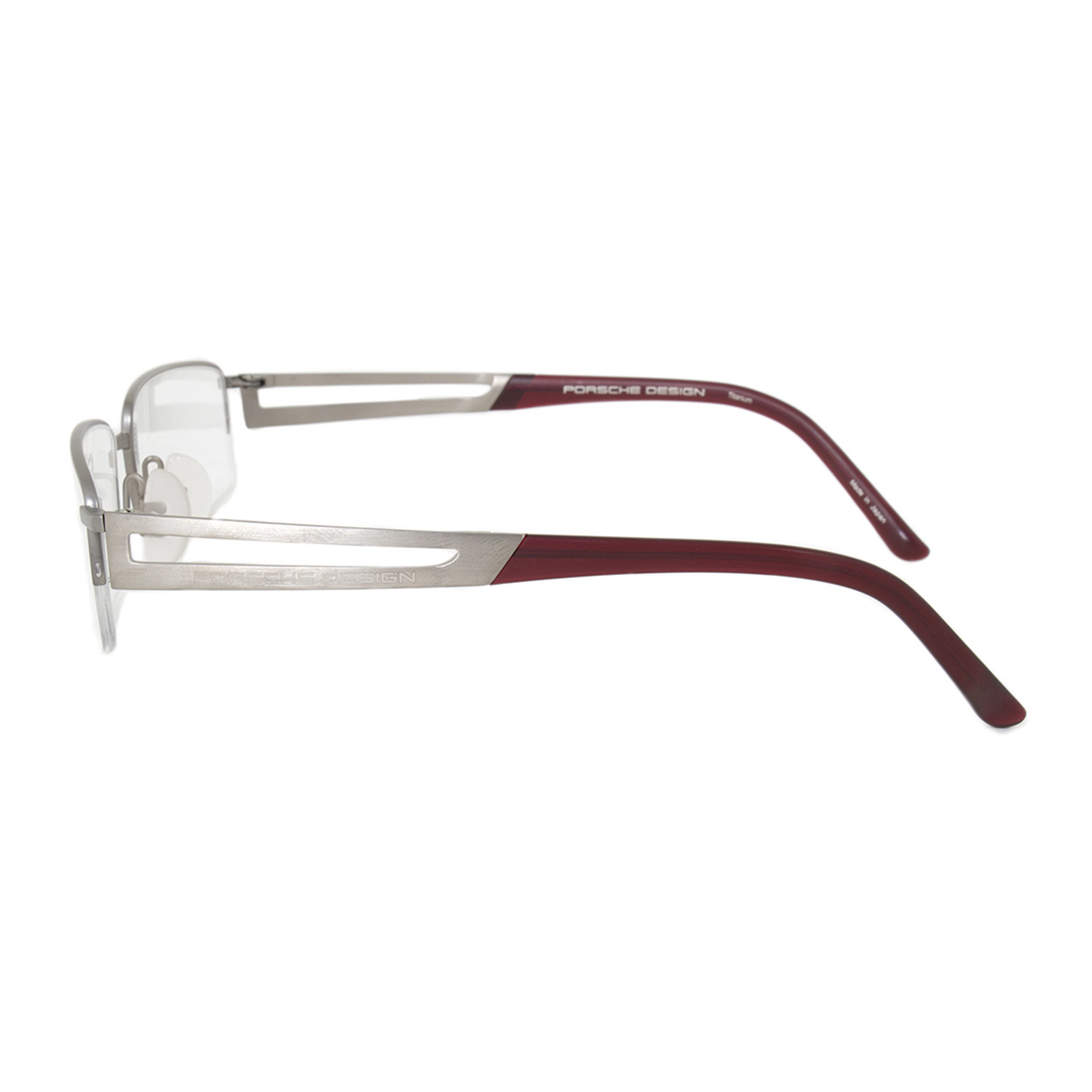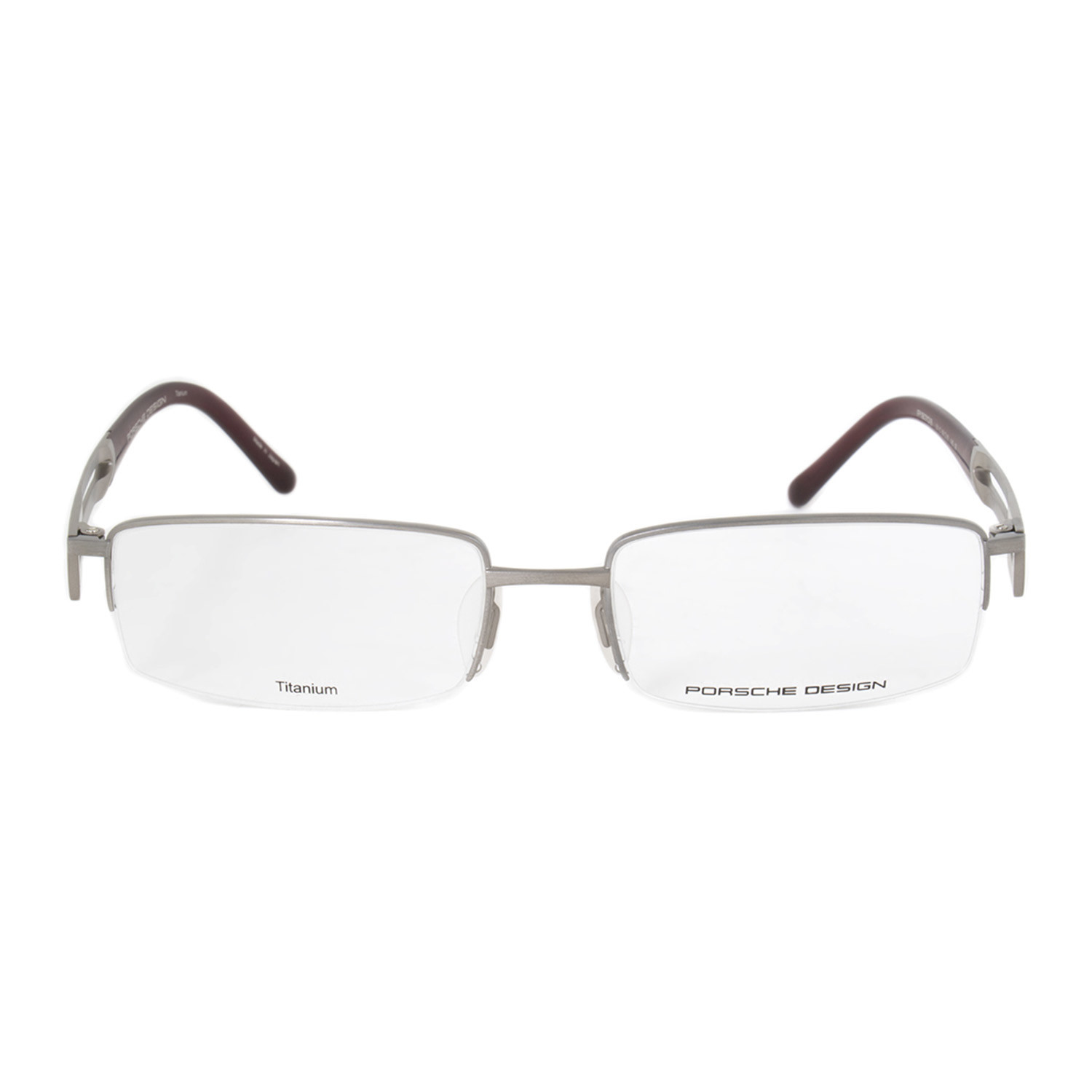 Look sleek and sophisticated in these sporty Porsche P8703 C eyeglasses for men. The rectangular frames are rimless at the bottom and rimmed in matte silver Titanium along the top half through the single bridge and hinges. The slender matte silver Titanium arms have the Porsche Design logo is inscribed at the temple and are tipped with matte burgundy acetate at the ends. These authentic designer eyeglasses measure 56-18-145 mm and ship with the Porsche lens case and lens cleaning cloth.