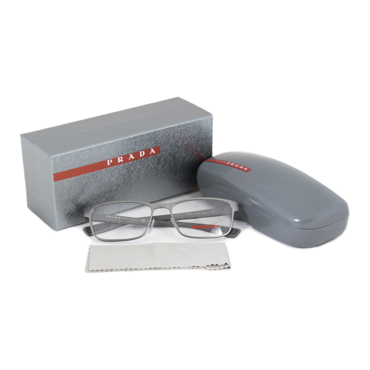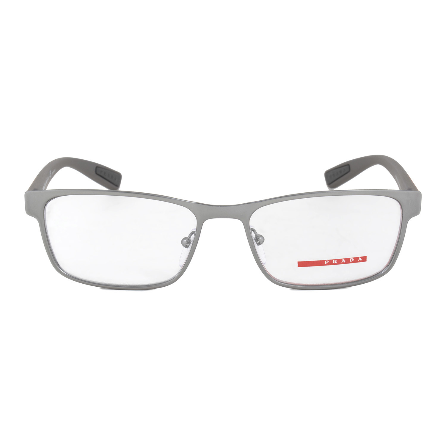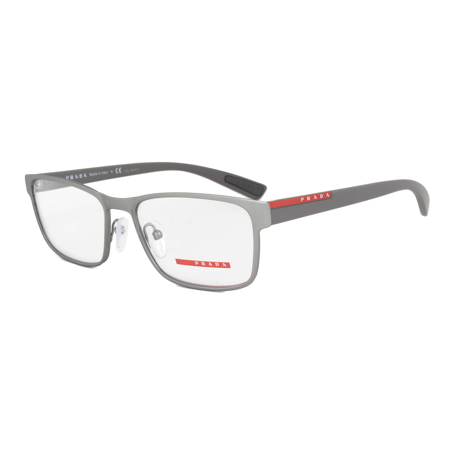Look sophisticated in these unique Prada Sport Linea Rossa 0PS50GV eyeglasses. The elegant rectangular frames are full-rimmed with matte silver rubber that has a luxurious smooth finish. The sleek grey arms feature the Prada logo on a red horizontal line at the temples for a sporty effect. These authentic designer eyeglasses measure 55-17-140 mm and ship with the branded Prada lens case and lens cleaning cloth.