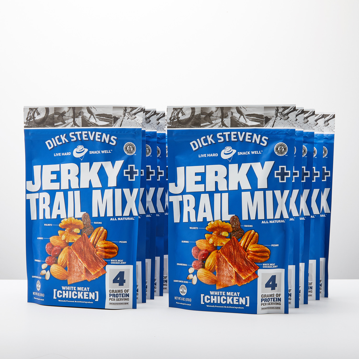 This Chicken Jerky Trail Mix is a delicious source of protein. Each pack includes a perfect blend of antibiotic, hormone and steroid free USA white meat chicken jerky, with raw pecans, walnuts, sunflower seeds, and almonds together with Michigan cranberries and plump California raisins. The result is deliciously gluten-free, paleo-friendly, low in saturated fat as well as sodium, and packed with 24g of all natural protein per bag.