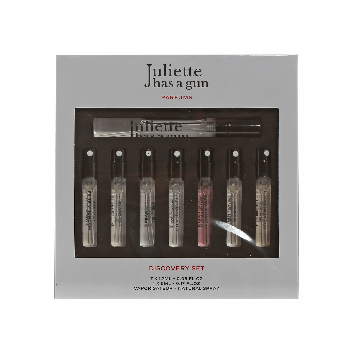 Juliette Has A Gun was created in France between Paris and Grasse by Romano Ricci, great grandson of Nina Ricci. A twisted heroine of Shakespeare transported into the 21st century with a gun, metaphor for her perfume. A collection of fragrances designed for one who also understands that wearing a signature scent goes far beyond the simple fact of smelling just “nice” It’s a statement. An affirmation of who you are. Romano Ricci aims to restore perfumes to what they should always be: emblems of style and originality. This set contains an assortment of sample sized Juliette Has A Gun fragrances.