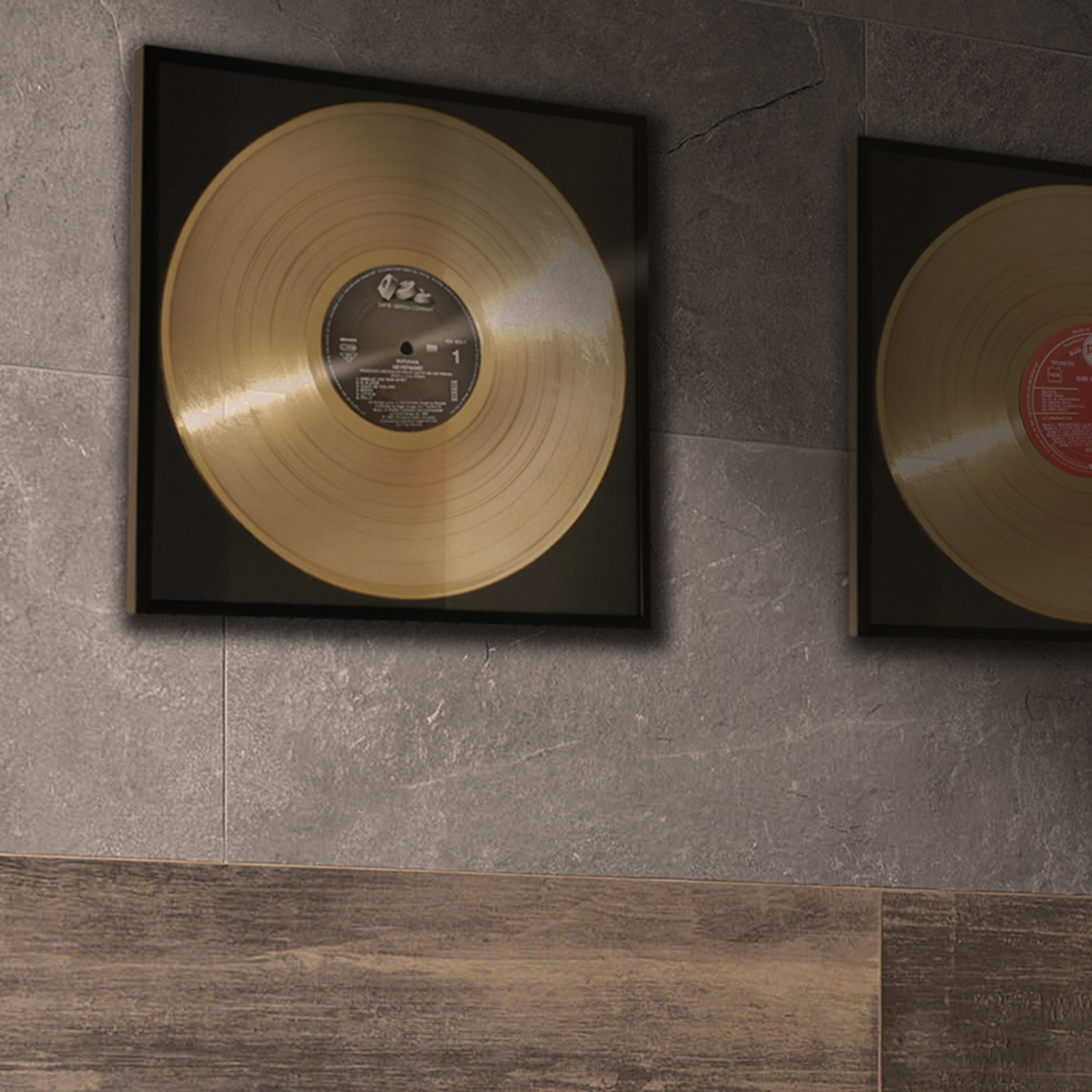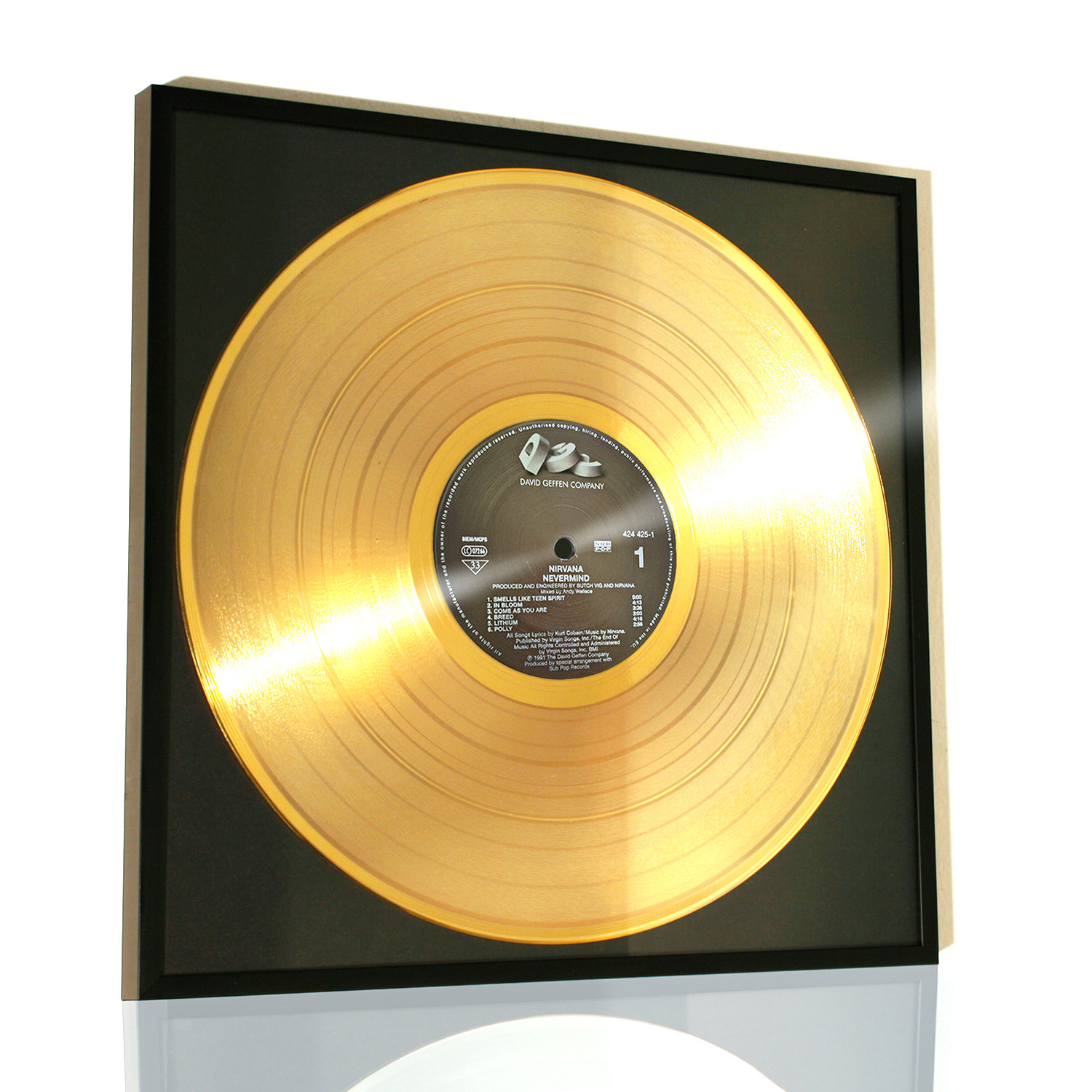 Here's your chance to own a gold plated record commemorative display of your favorite musical artist. Nirvana's Nevermind has a bright mirror-like finish that is a real eye catcher when you walk into a room with one of these on the wall. These one-of-a-kind displays are produced from a multi-step electroplating process (not sprayed, painted or dipped), just as real record awards are made. All the records are vintage materials purchased on the open market and produced as a collectible. The protective varnishing will guarantee that the record will never fade, corrode or tarnish. It's finished with a black anodized aluminum frame and front polycarbonate protection.
