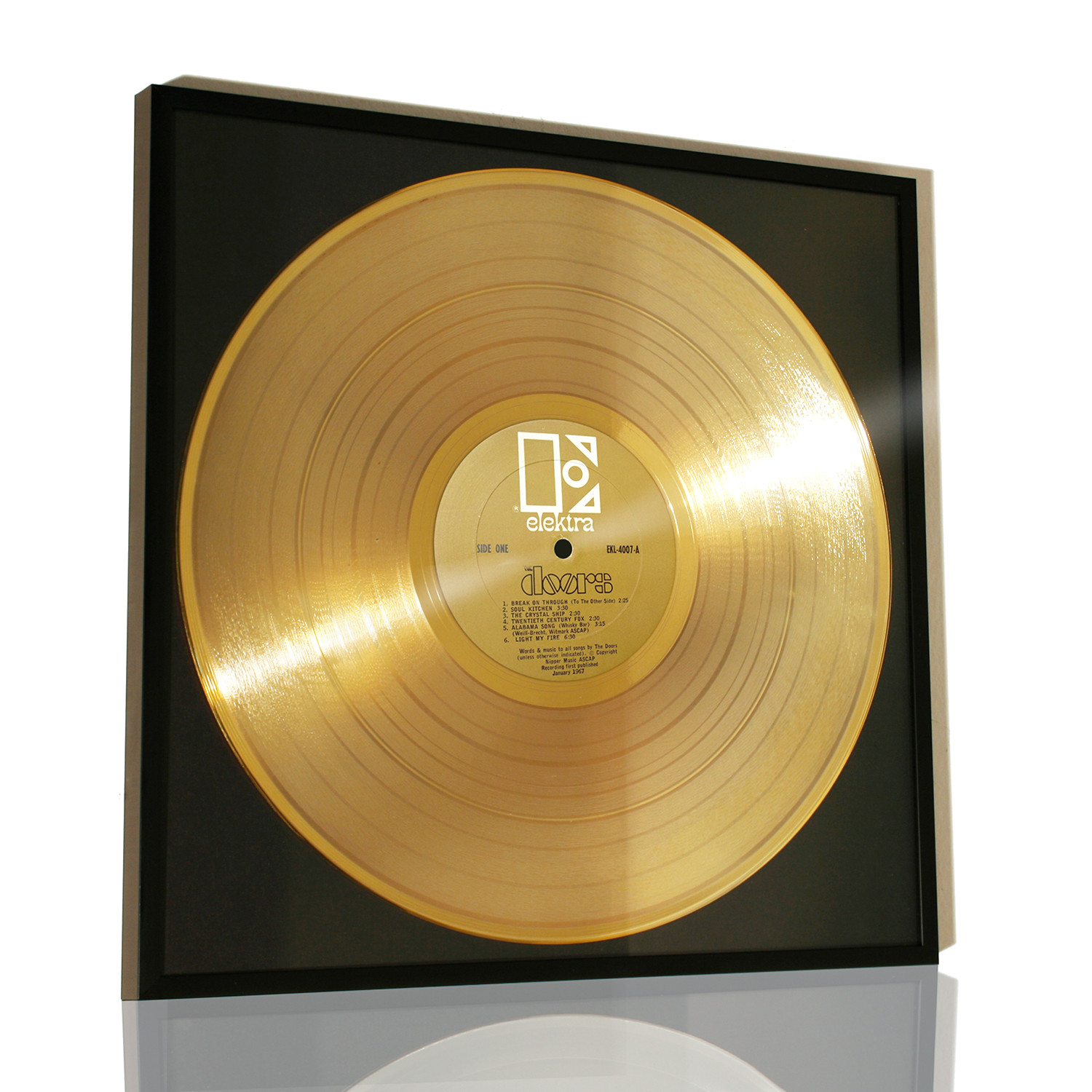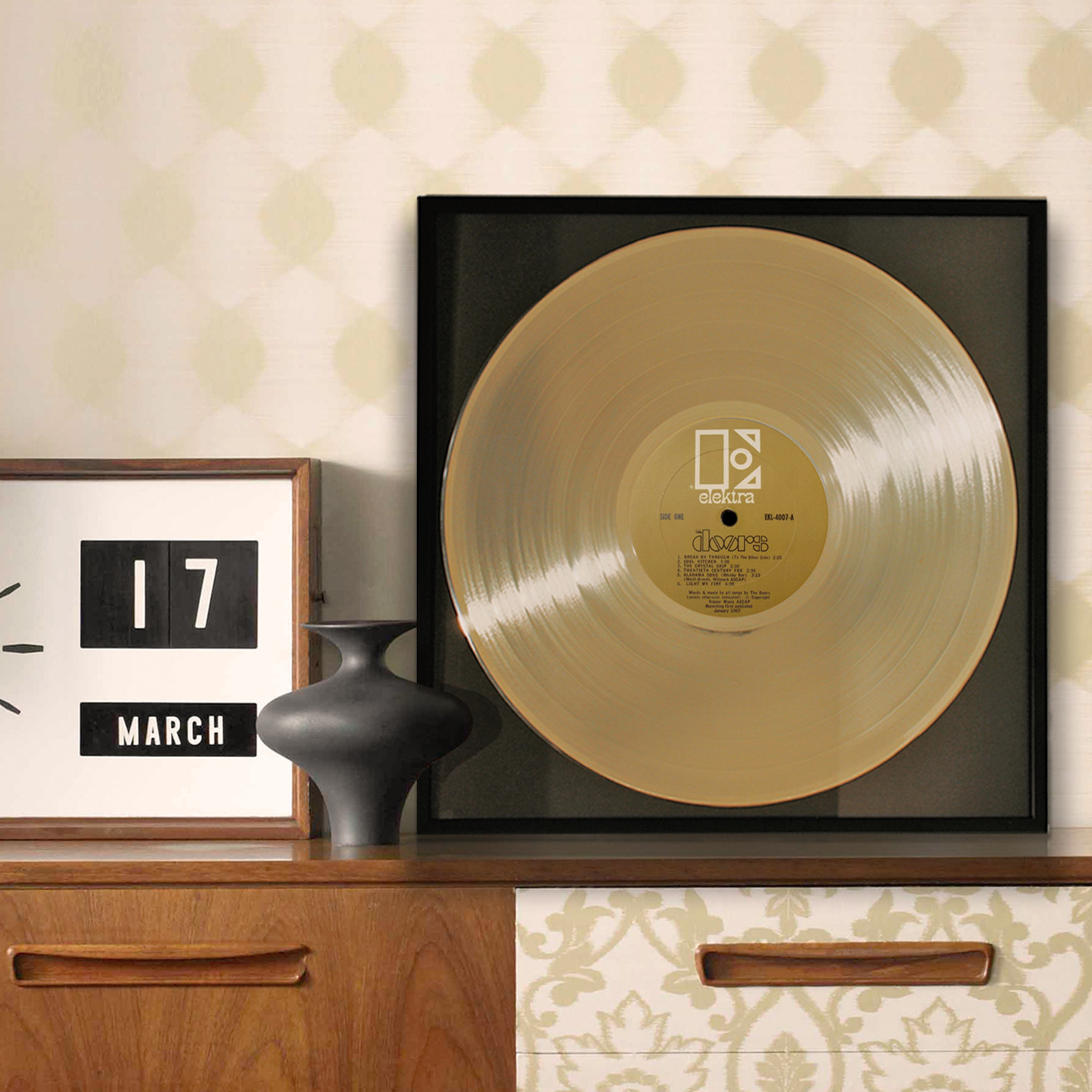 Here's your chance to own a gold plated record commemorative display of your favorite musical artist. The Door's first album has a bright mirror-like finish that is a real eye catcher when you walk into a room with one of these on the wall. These one-of-a-kind displays are produced from a multi-step electroplating process (not sprayed, painted or dipped), just as real record awards are made. All the records are vintage materials purchased on the open market and produced as a collectible. The protective varnishing will guarantee that the record will never fade, corrode or tarnish. It's finished with a black anodized aluminum frame and front polycarbonate protection.