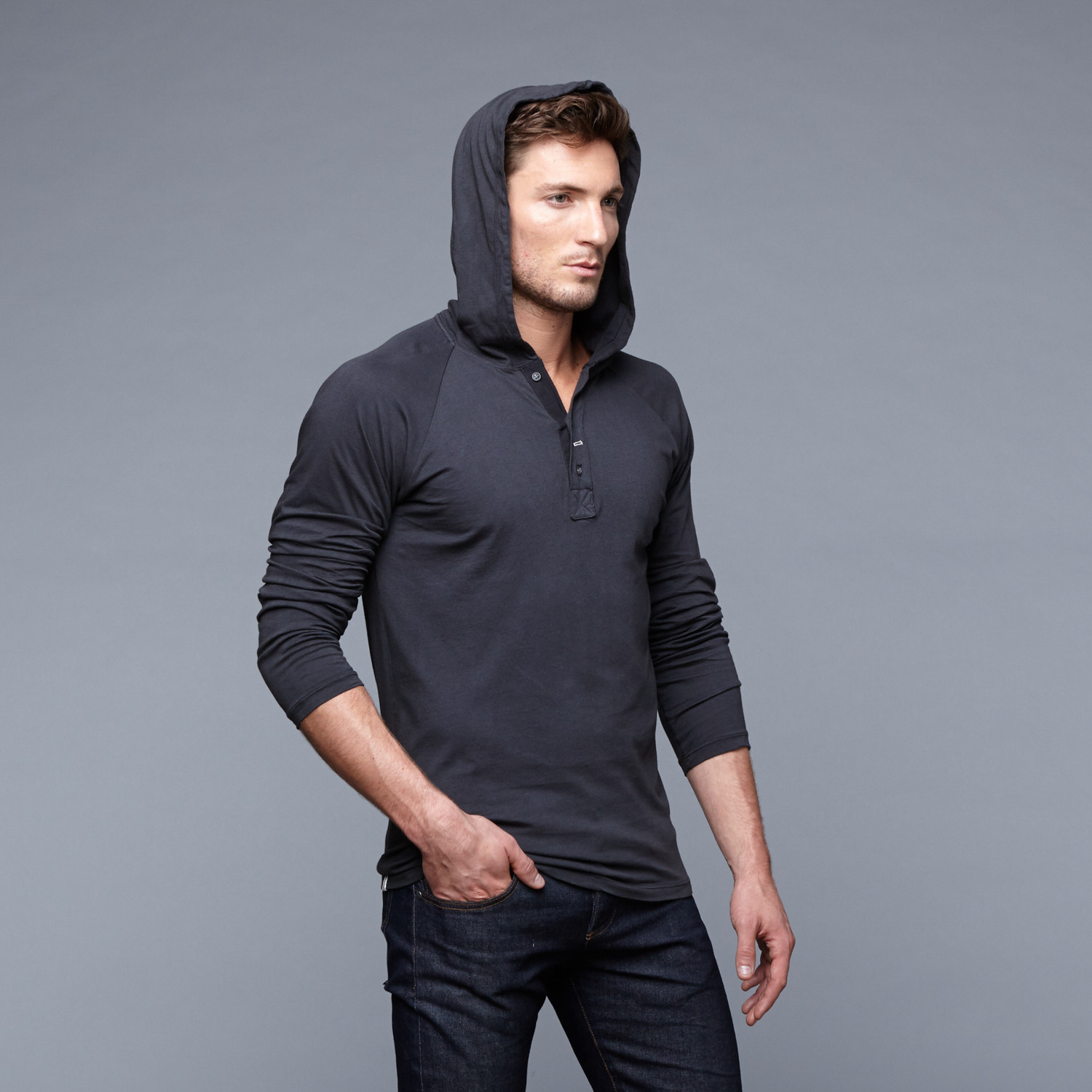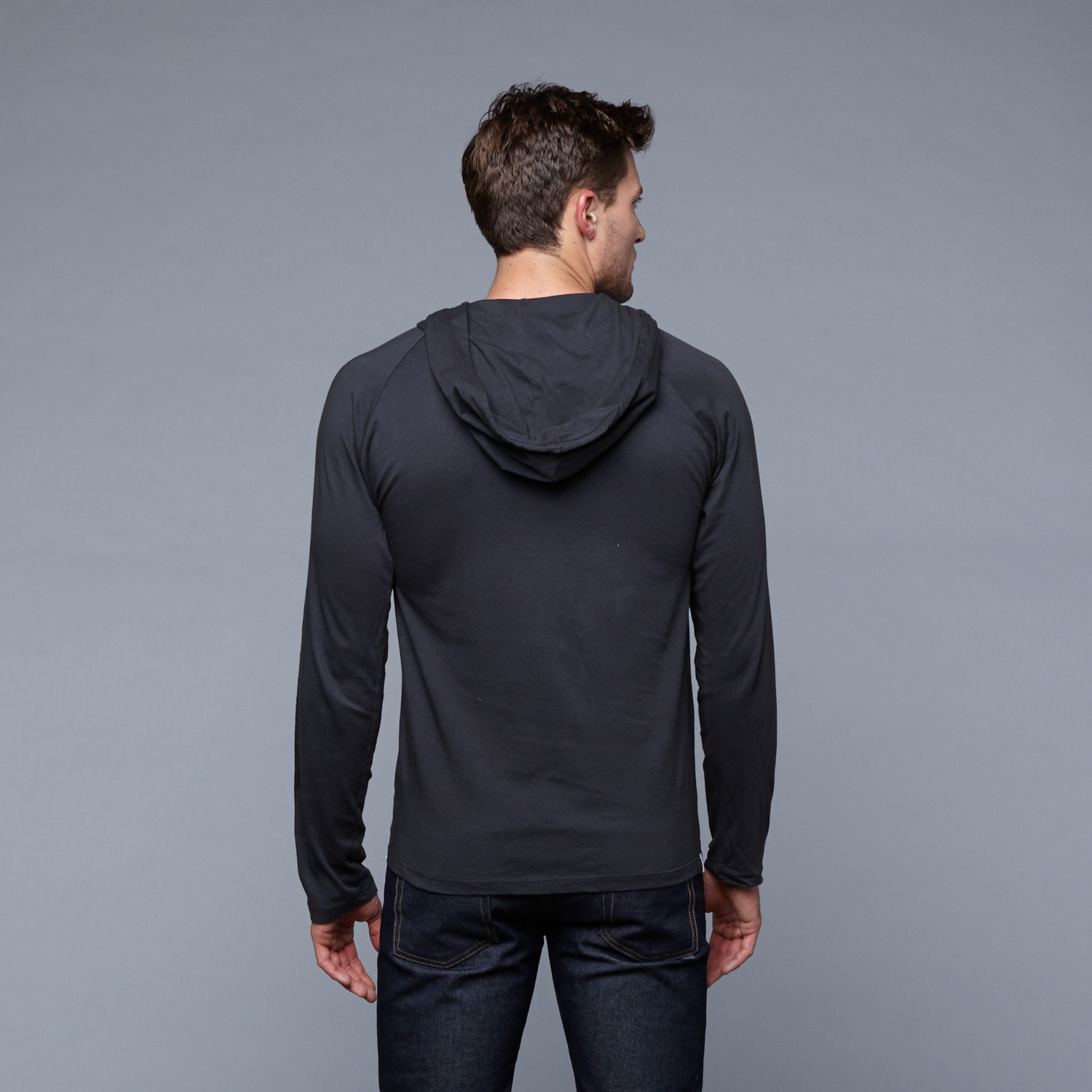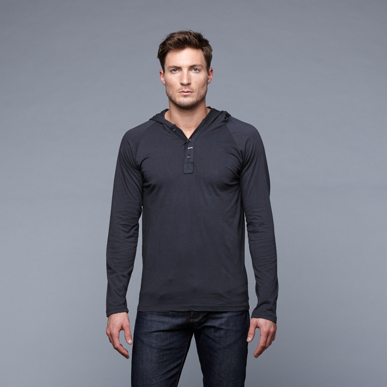 This Hooded Henley is an essential with a twist. A striped, oxford fabric placket and angled contrast button hole juxtapose nicely with the shirt's faded front.