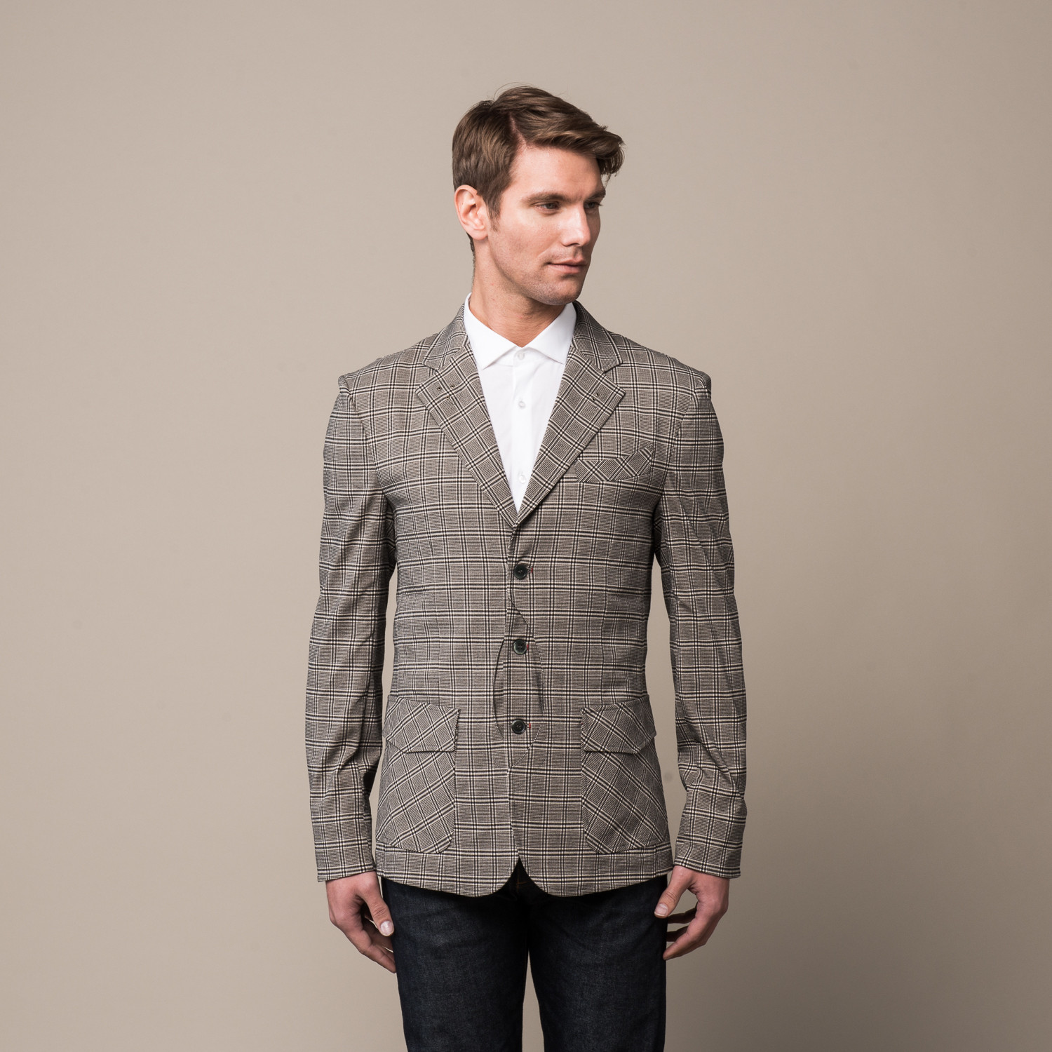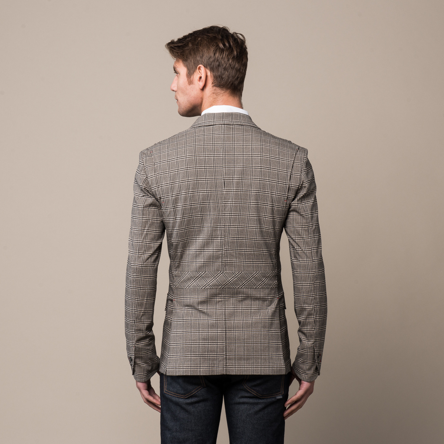 This Scottish hunting blazer gets its name from its real mother of pearl buttons. A hidden ventral pocket provides a space to slip your cell phone or some cash; rear shoulder slits expand your range of motion while adding striking design contour; and the light-weight black and ivory plaid cotton twill fabric comprises both the stylish outer shell and the exquisitely detailed inner lining.Â