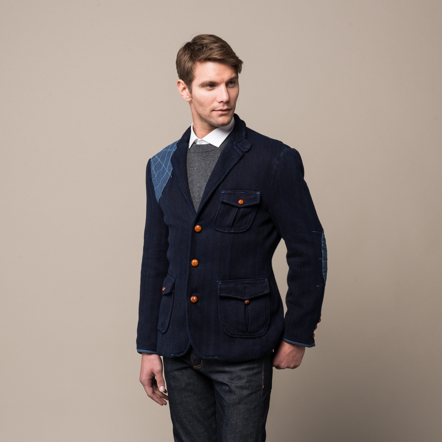 Elites of Japan’s historic warrior class may have publicly frowned upon this slim-fitting kimono-inspired jacket, but they couldn’t help privately admiring its aesthetic appeal. Soaked ten times using the traditional Kyoto dye method, the jacket’s 100% double-woven cotton outer shell is then washed five times with the flannel inner lining to bleed the fabrics together, yielding a spectrum of rich indigo colors unique to each jacket. Densely woven linen patches are stitched to the elbows and shoulder with a dramatic zigzag pattern reminiscent of a skillful Samurai sword move. This jacket’s svelte fit is more evocative of modern Harajuku than historic Kyoto, but a trace of tradition remains in the integrated waist band inspired by judo belts. Tanned leather buttons provide a warm visual contrast and round out its look.