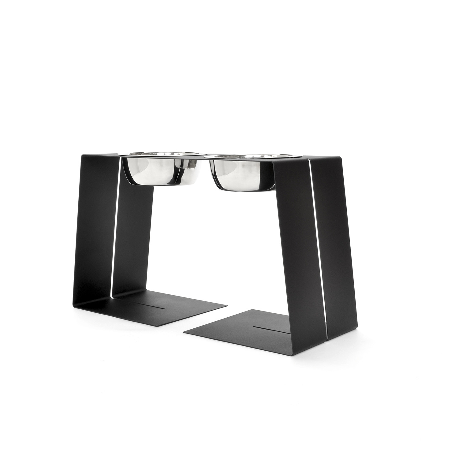 These minimal powder coated steel pet bowl holders have a textured finish that resists scratches and a rubber non-skid bottom. These stylish feeders keep your beloved pet's food and water off the ground too. They are the perfect modern pieces for any contemporary, pet-friendly household.