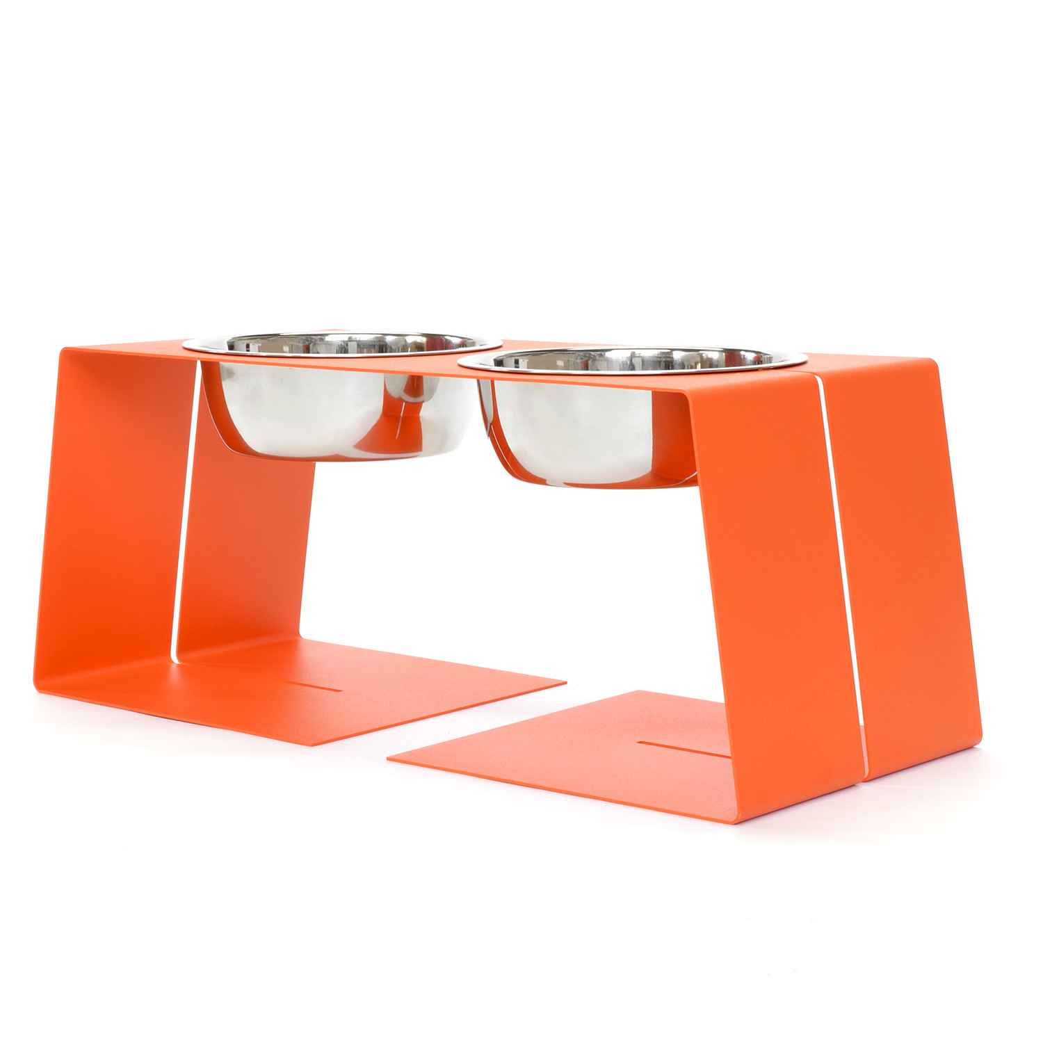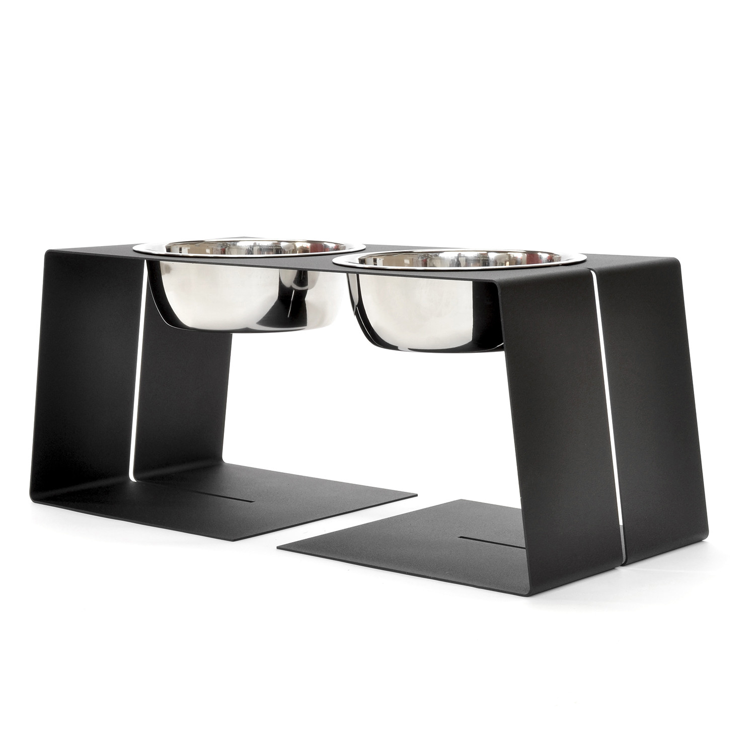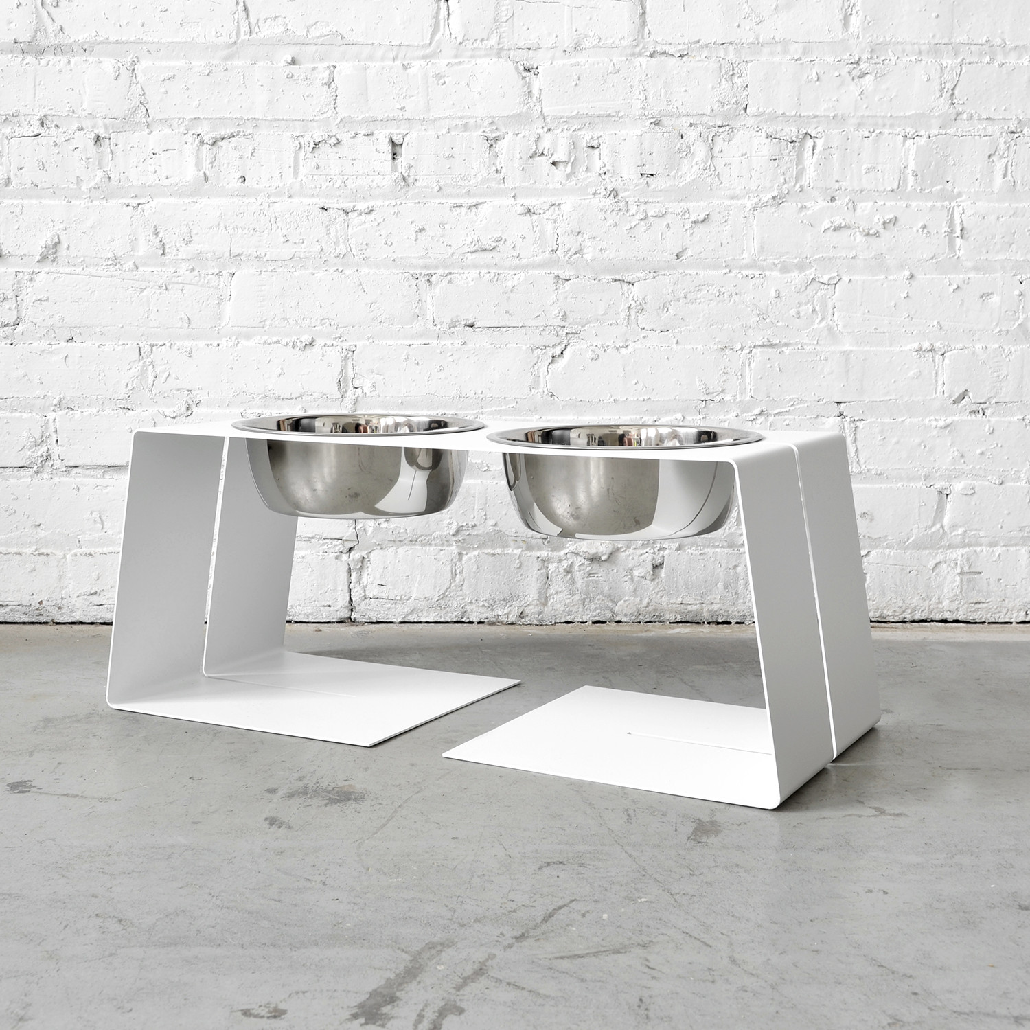 These minimal powder coated steel pet bowl holders have a textured finish that resists scratches and a rubber non-skid bottom. These stylish feeders keep your beloved pet's food and water off the ground too. They are the perfect modern pieces for any contemporary, pet-friendly household.